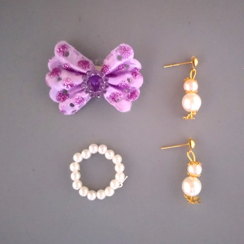 В комплект входит 13 аксессуаров: 5 больших свадебных платьев (случайные разные цвета), 3 черных очки, 1 шляпа, 1 гребень, 1 серьга, 1 ожерелье, 1 бант.