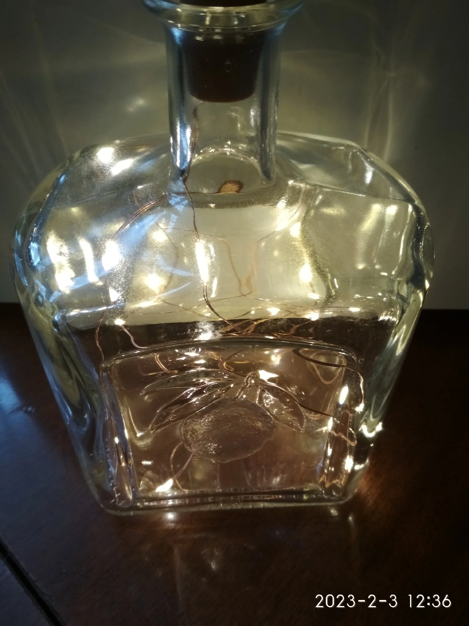 Шикарно смотрится в коричневой бутылке! Всё горит- светится! Упаковано хорошо. Без батареек.