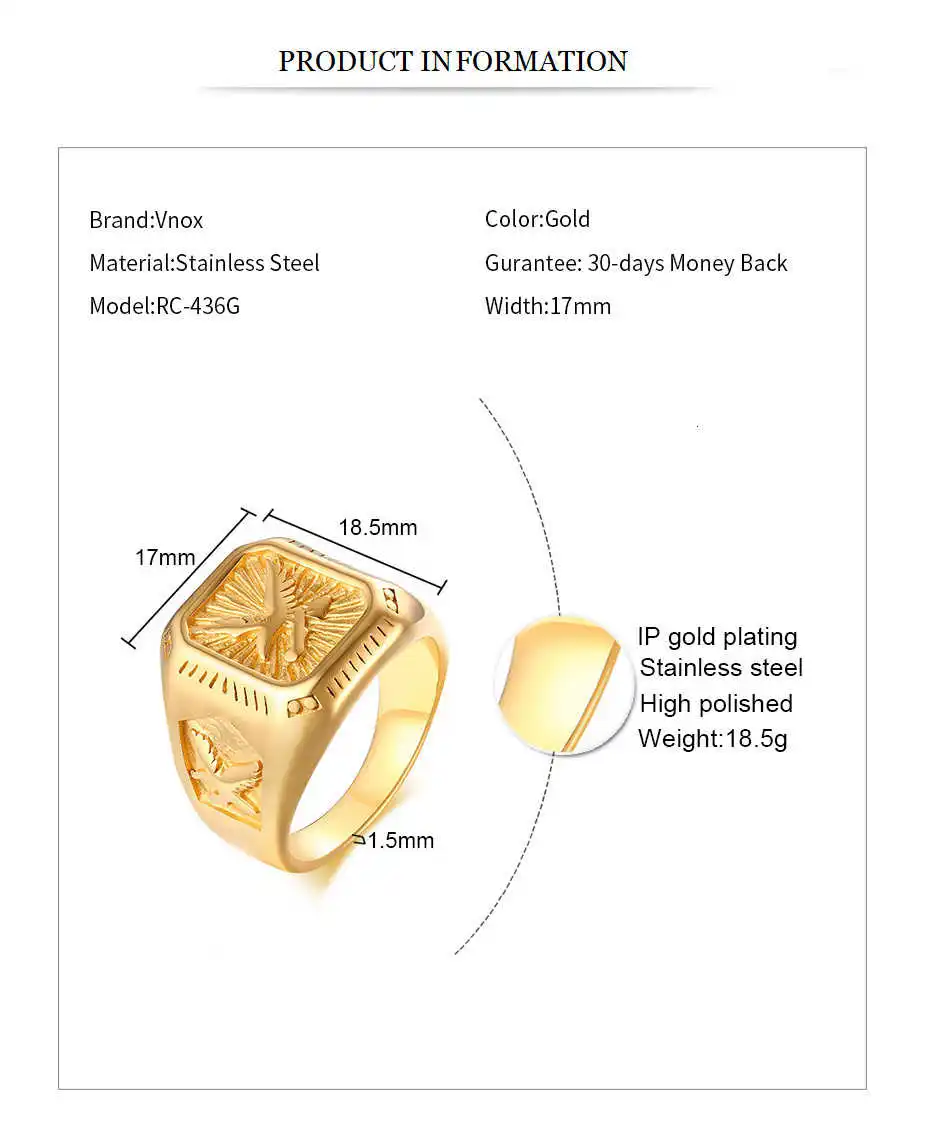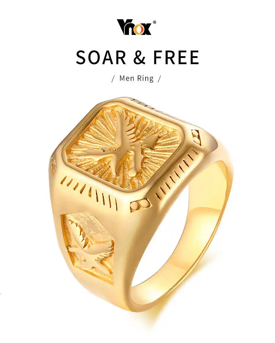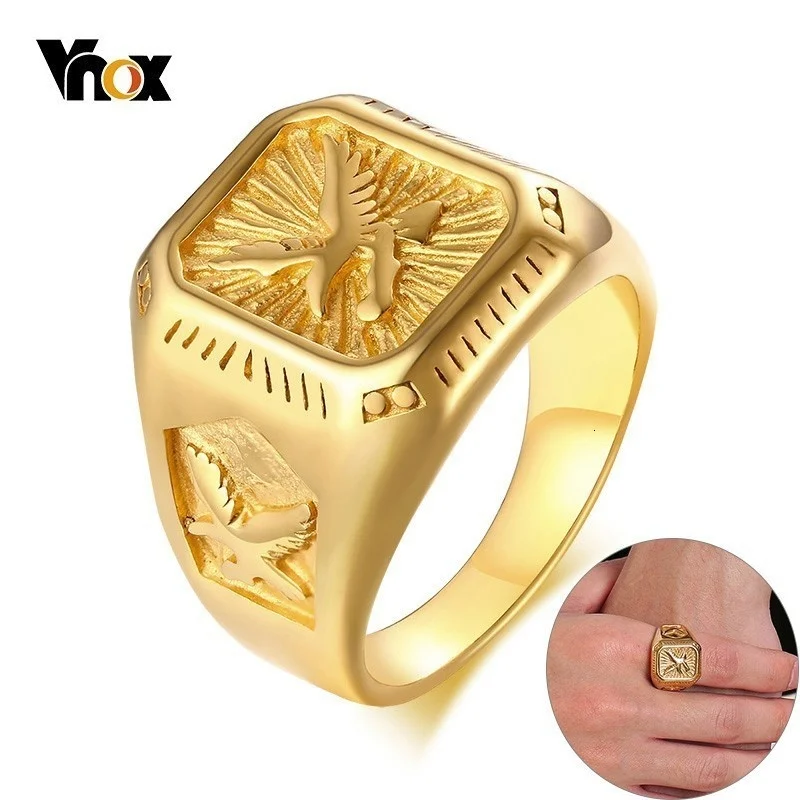 Массивное мужское кольцо Vnox с орлом, Золотое кольцо с квадратным верхом из нержавеющей стали с лучами, кольцо с тяжелой печаткой в виде животных
