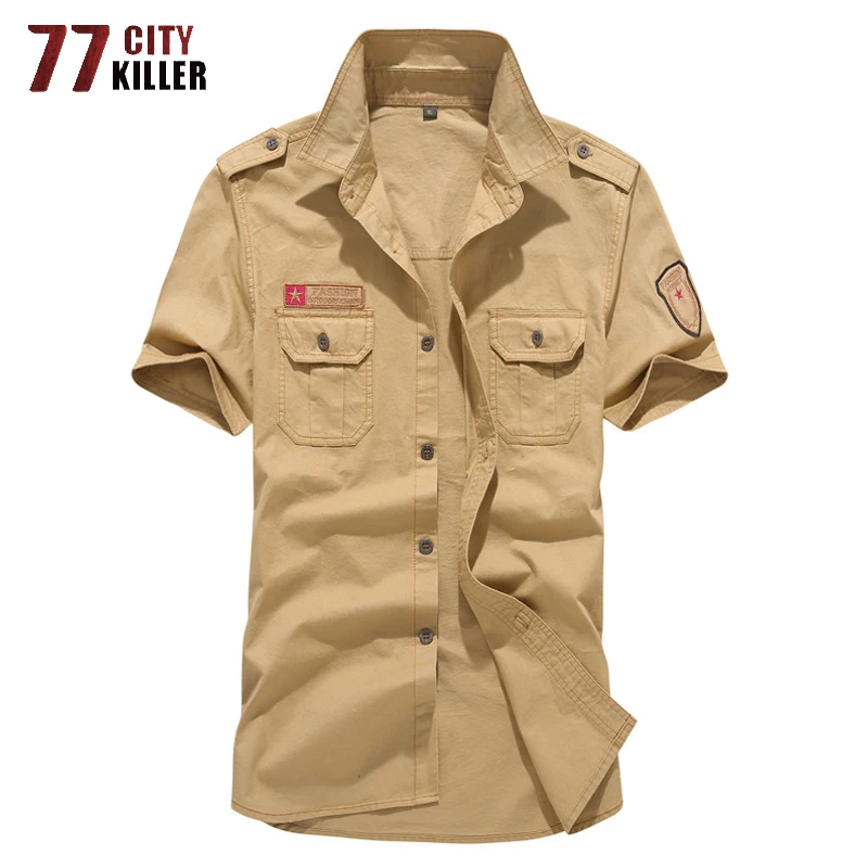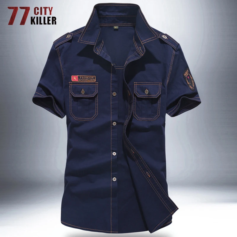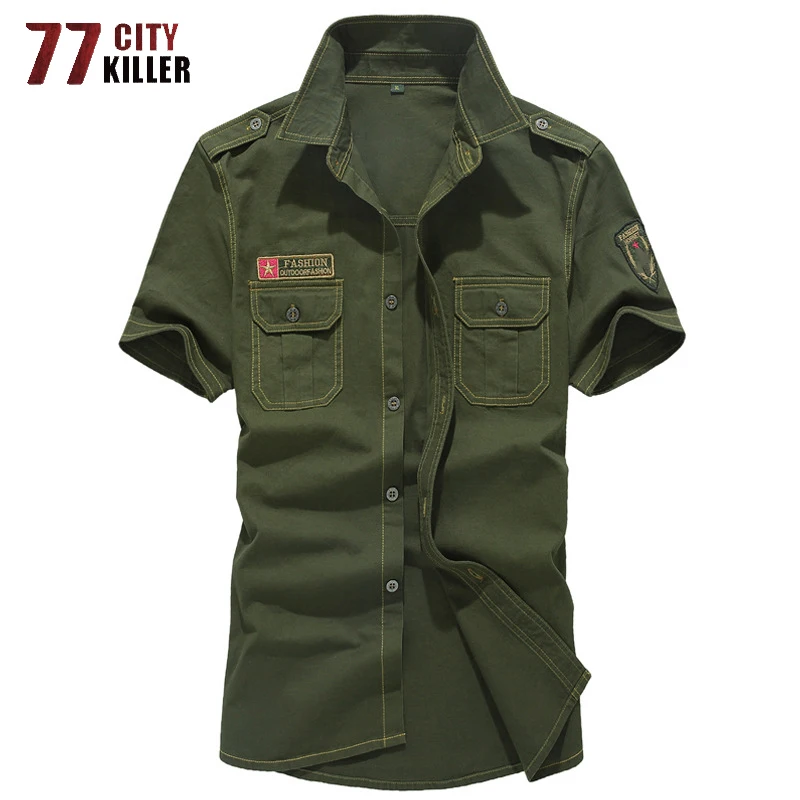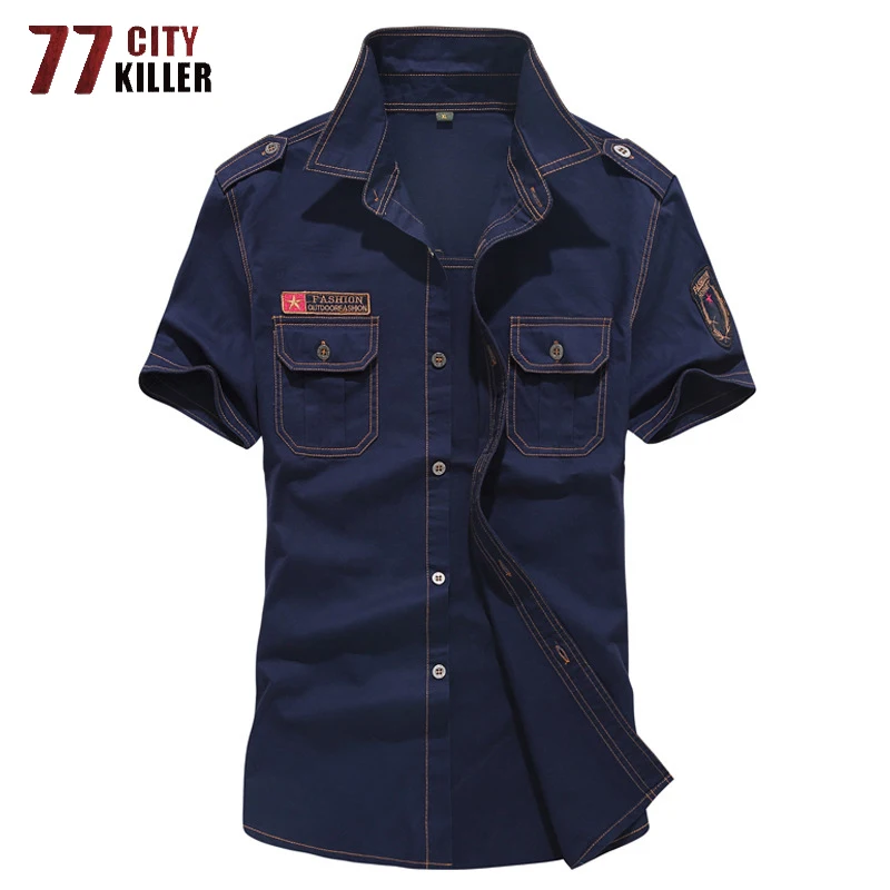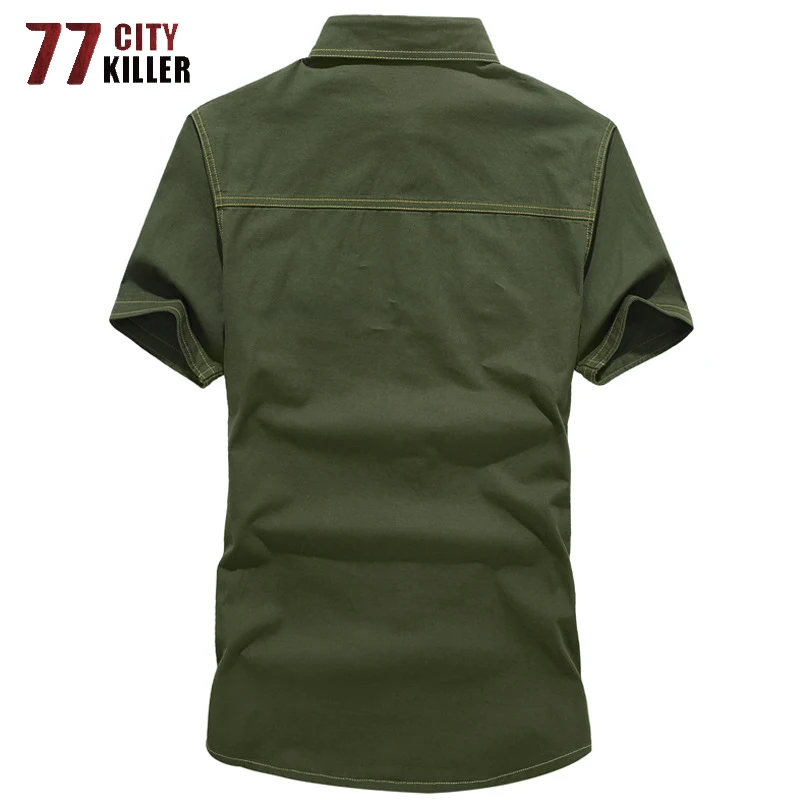 Мужская рубашка с коротким рукавом, хлопковая рубашка в стиле милитари, с принтом и множеством карманов, модель размера плюс на лето, M-6XL