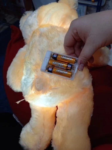 медведь очень милый, мягкий, пушистый, я купила белого. возможно, чуть меньше заявленных 50 см, но это не портит впечатление. он самостоятельно сидит, не прислоняясь ни к чему! ножки свободно свисают. т.е. он не зафиксирован в сидячем положении, его можно положить, посадить, взять на руки - он меняет форму согласно положению. работает на трёх пальчиковых батарейках (не входят в комплект). переливается разными цветами. заказала 13.11, получила 29.11. с купоном заплатила около 450 руб. на распродаже 11.11. спасибо, очень довольна медведем! у меня ещё никогда не было такой славной игрушки. отлично смотрится на кровати, оживляет интерьер.