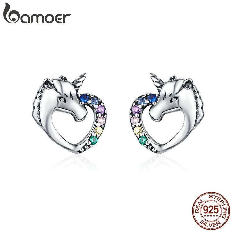 Женские серьги с единорогом BAMOER, из серебра 925 пробы, с любовным сердцем, с фианитами, гипоаллергенный стержень