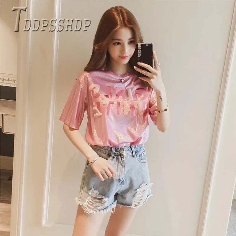 Женская Блестящая футболка, розовая, фиолетовая, белая футболка с коротким рукавом, лето 2019