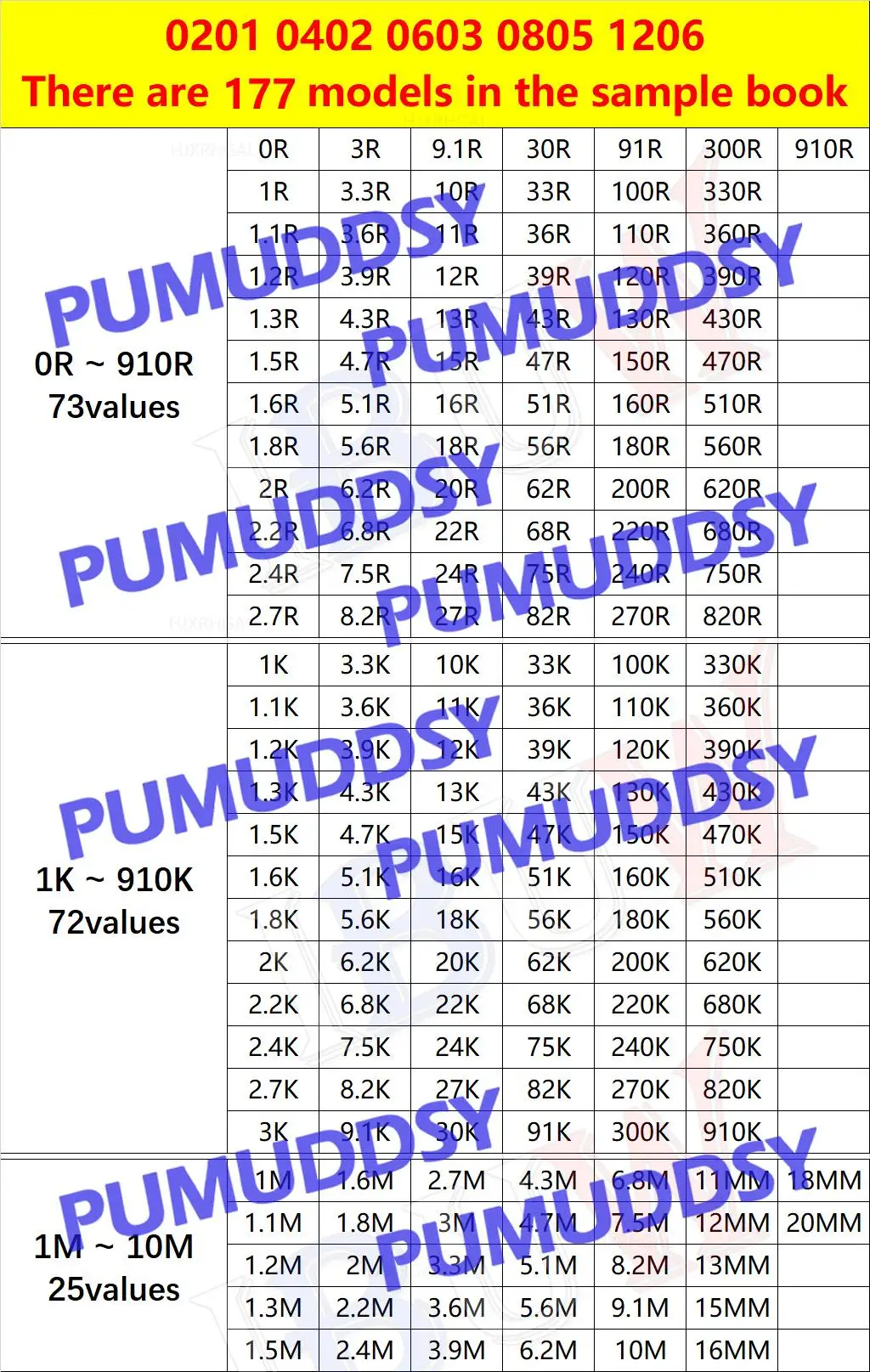 170 значений * 50 шт = 8500 шт 0201 0402 0603 0805 SMD резистор 1% 0R 10 м Образцы книги резисторы Ассортимент Набор резисторов