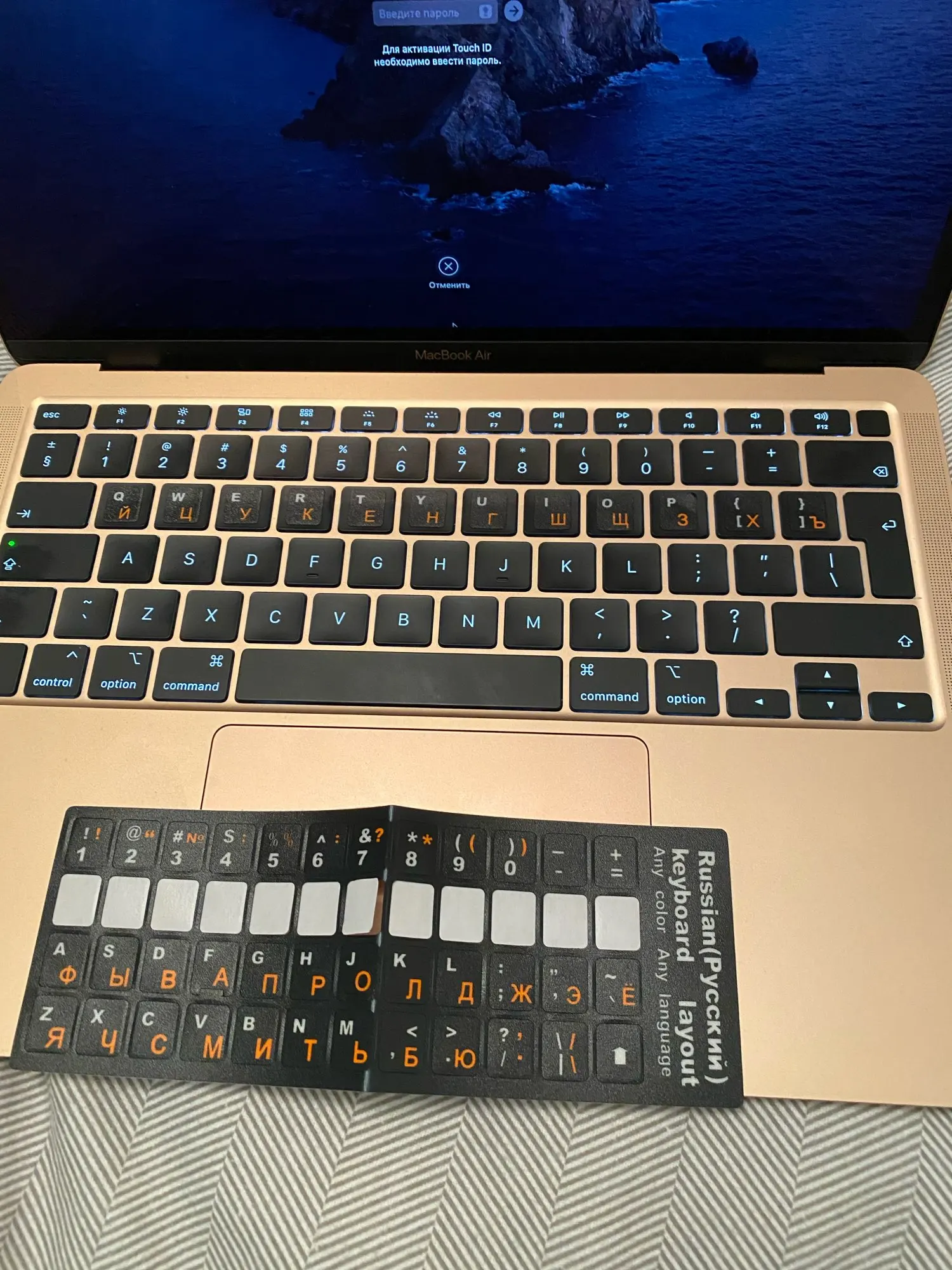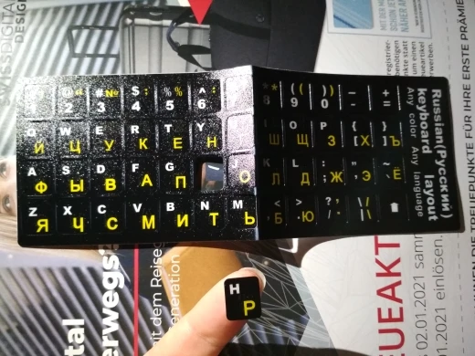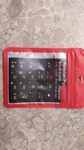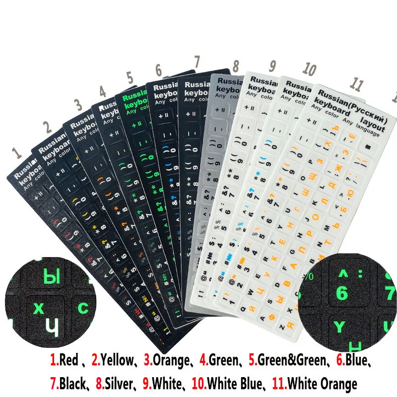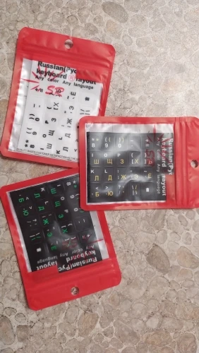 Отдичные наклейки, особенно с зелеными русскими буквами. Клеятся легко и прочно - стоит использовать пинцет (прислали с 1 набором), чтобы точно распложить на клавише перед фиксацией надавливанием. Переклеить, если косо, тоже можно, но сложно отодрать. Светящиеся наклейки менее удобны. Доставили за недели 3.