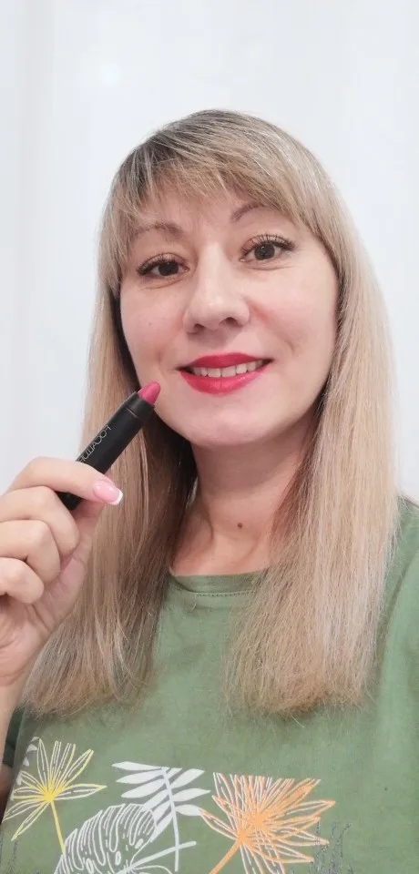 Хорошая помада, мне очень понравилась. На мне цвет более тёмный. Почти не сушит. Отпечатки оставляет, стирается просто салфеткой