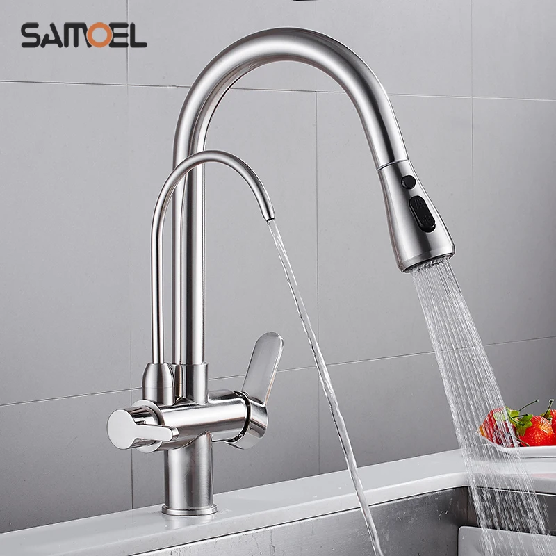 Samoel, латунный кухонный фильтр для воды, смесители, матовый никель, 3 способа, двойная ручка, одно отверстие, вытяжной кран для раковины, NL709