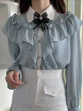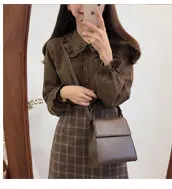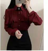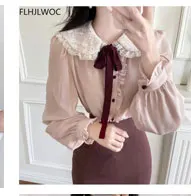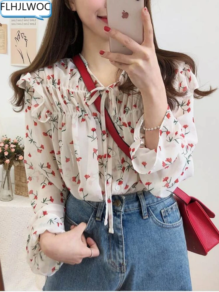 Женская шифоновая блузка с длинным рукавом, красная блузка с цветочным принтом и оборками в Корейском стиле, винтажная блузка с бантом и цветочным принтом