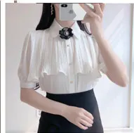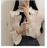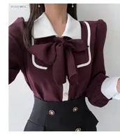 Шифоновые блузки, рубашки для женщин, топ в Корейском стиле, одежда с длинным рукавом, красный цветочный принт, гофрированный Топ, галстук-бабочка, Цветочная блузка, винтажная