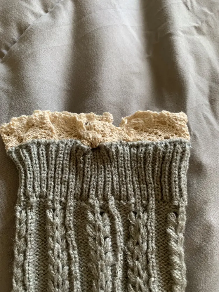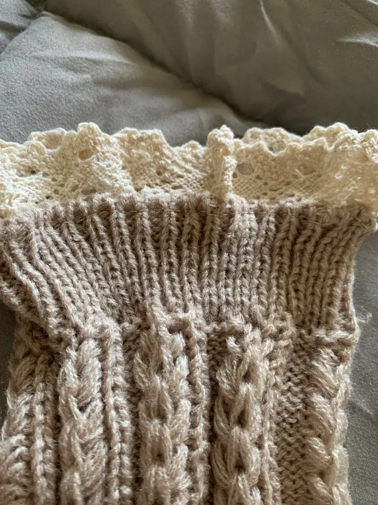 к внешнему виду претензий нет - кружева пришиты ровно, нитки не торчат, цвет в точности как на фото. Пряжа смесовая, какой-то процент шерсти присутствует, очень довольна покупкой