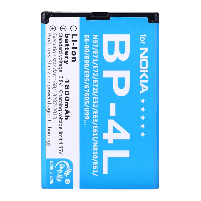 Большое спасибо за покупку нашей продукции, наша компания обещает гарантию 12 месяцев, батарея имеет любую проблему качества, в течение 12 месяцев, мы будем свободны для покупателя, чтобы отправить новый аккумулятор. Escription: 1. Литий-ионный аккумулятор: BP-4L 2. Напряжение: 3,8 V 3. Емкость: 1800 мАч 4. Применение: Для Nokia E61i E63 E90 E95 E72 E52 E71 6650F N810 N97 5. Безопасность и окружающая среда: двойные функции защиты. Двойная IC и PCB электрическая плата защищают от разряда заряда и короткого замыкания. 6. Наша батарея одного размера с оригинальной батареей. 7: Сделано в CNINA Пожалуйста, обратите внимание: > Аккумулятор должен быть полностью заряжен перед использованием. > Временная короткая емкость нового аккумулятора будет получена в результате длительного использования, это нормально, общая емкость будет восстановлена через используется в течение 3-5 раз. > Когда сначала получите аккумулятор, используйте его, заряжайте в течение 10 часов в течение первых трех раз, используйте его снова, затем ему нужно только зарядить около 5 часов для нормального использования. > Не используйте низкое зарядное устройство, чтобы зарядить этот аккумулятор в чехол от повреждения аккумулятора. > Не разбирайте и не меняйте структуру аккумулятора. > Не помещайте аккумулятор в зарядное устройство слишком долго. > Не подвергайте аккумулятор воздействию влаги и воды, не помещайте его в высокотемпературную среду. > Не влияет на батарею. > Поставьте его вне досягаемости детей. > Лучшая температура хранения составляет 20 °C-5 °C