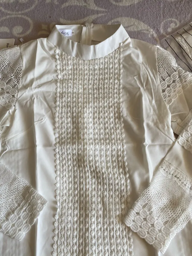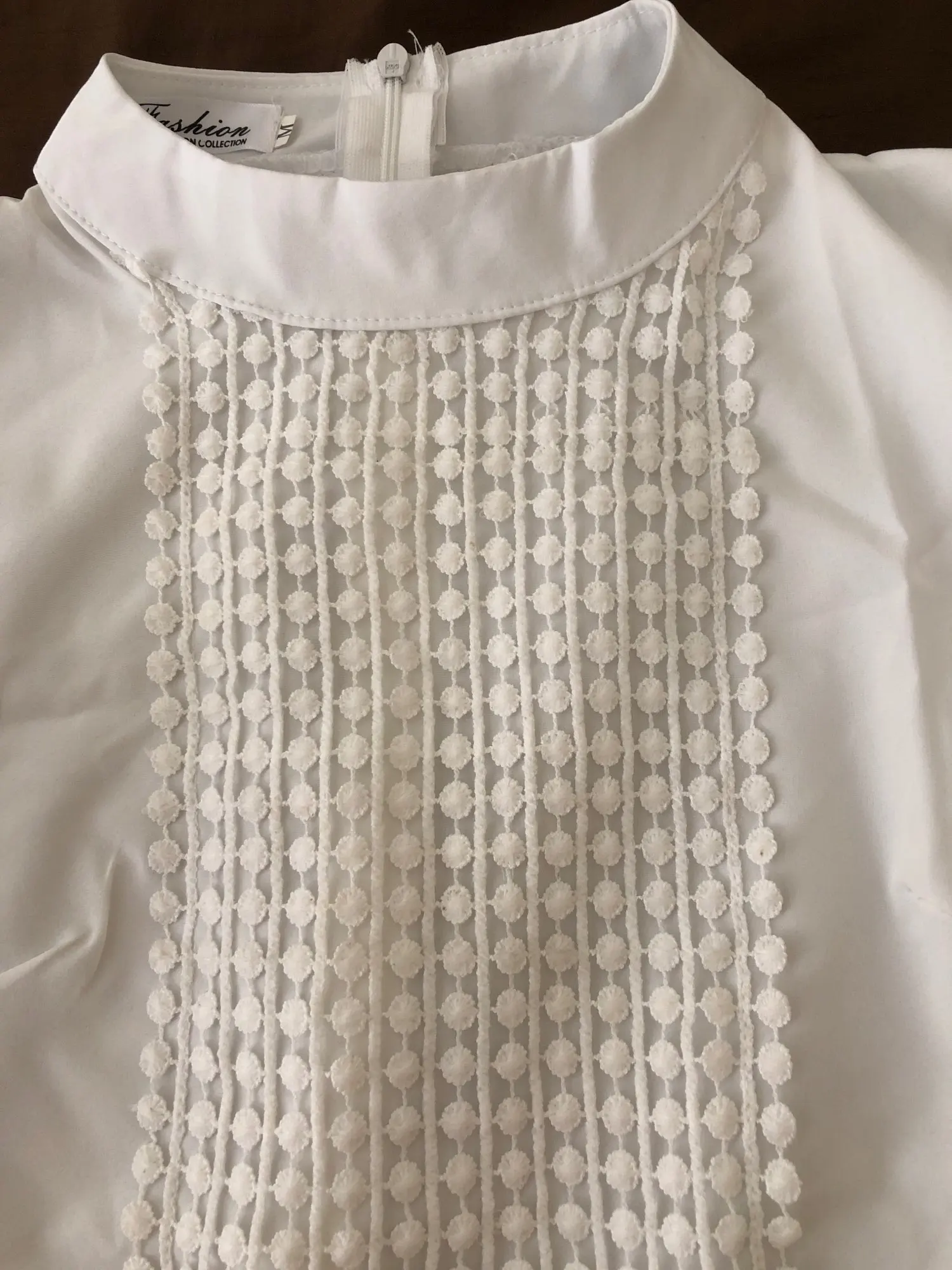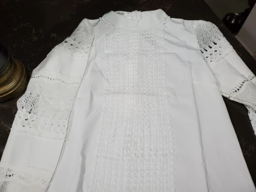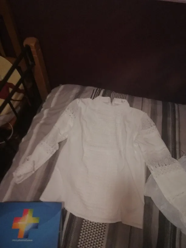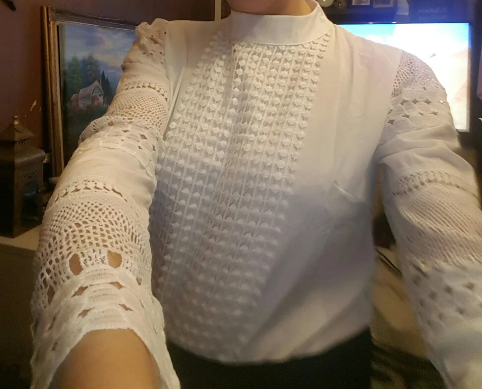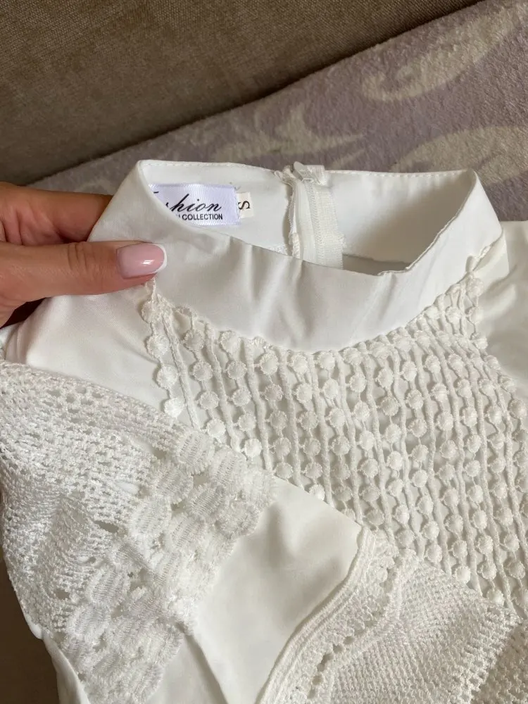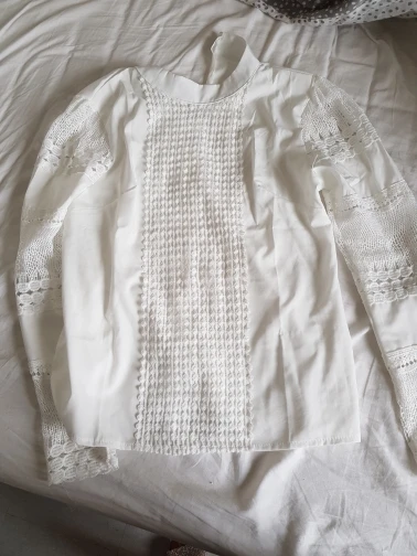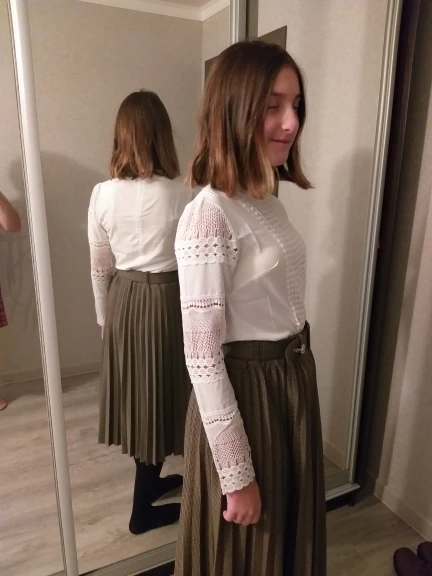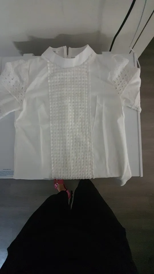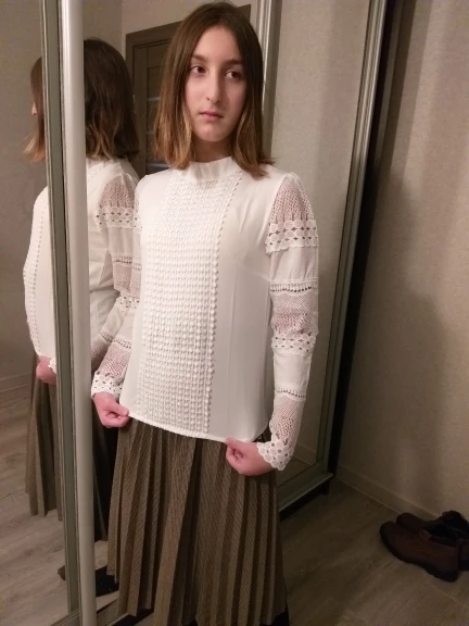 На фото выглядит намного элегантнее, чем в жизни. Размер оказался маловат, поэтому непонятно, как сидит. Блузка может подойти разве что для парадной школьной формы для девочки.