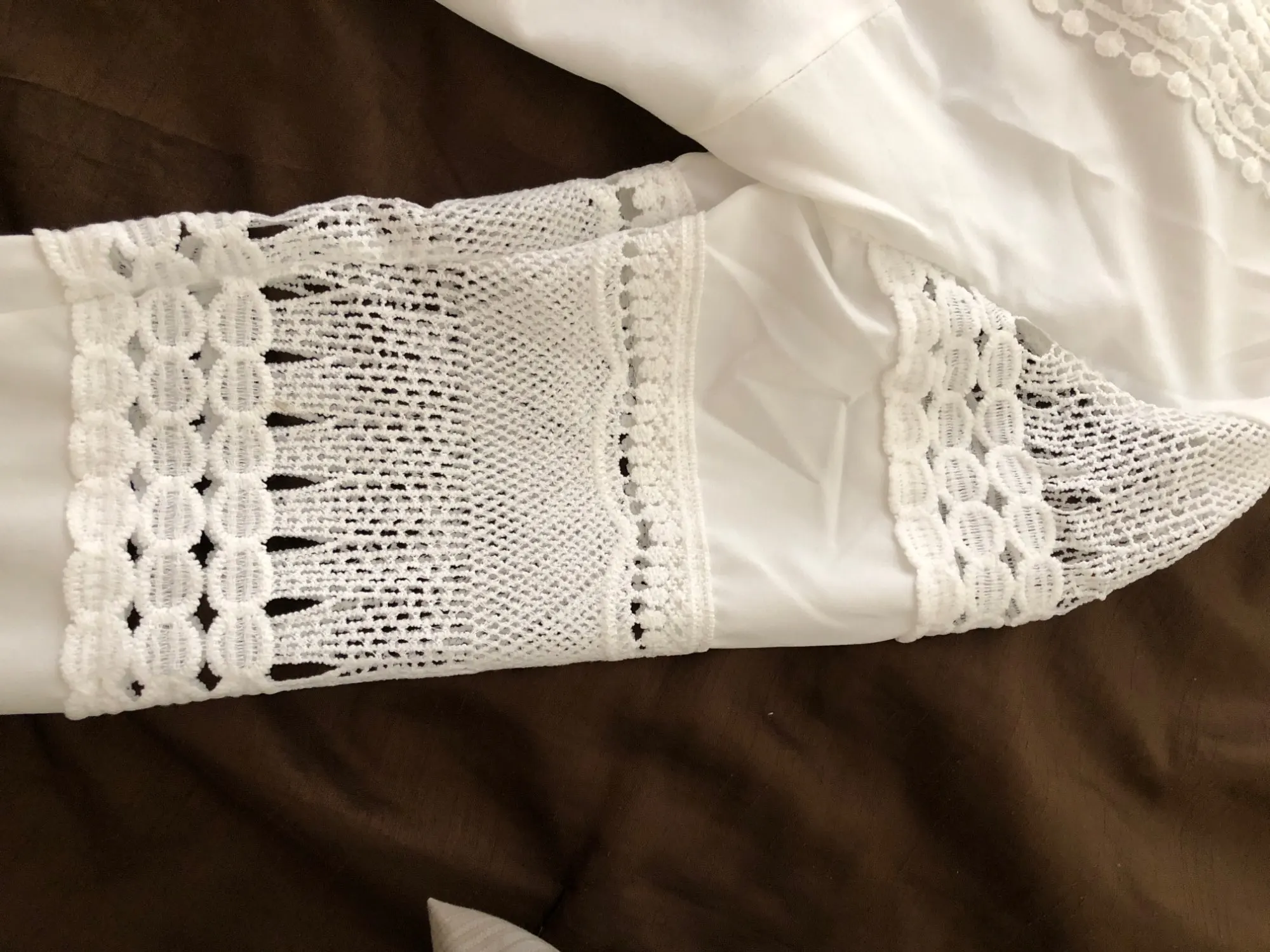 доставка 3 недели. заказала XL на параметры 90-70-94 (Росс 44 или М), за 765₽. лично мне в рукавах на уровне 3/4 тесновато. в остальном все хорошо. ткань приятная, практически не тянется. поэтому если любите чтобы было посвободнее, реально на 2-3 размера больше обычного брать. прекрасный вид. кружево пришито аккуратно. праздничная блуза. я счастлива и рада этому приобретению