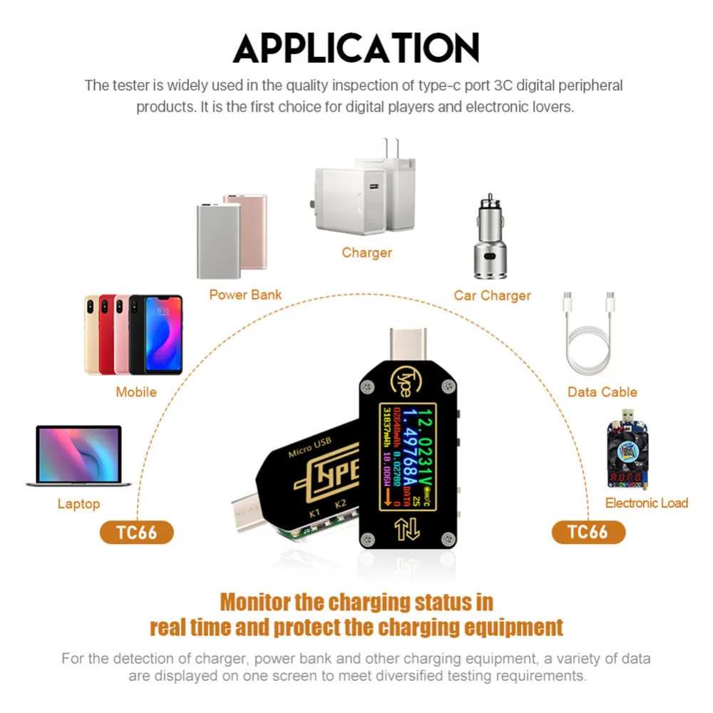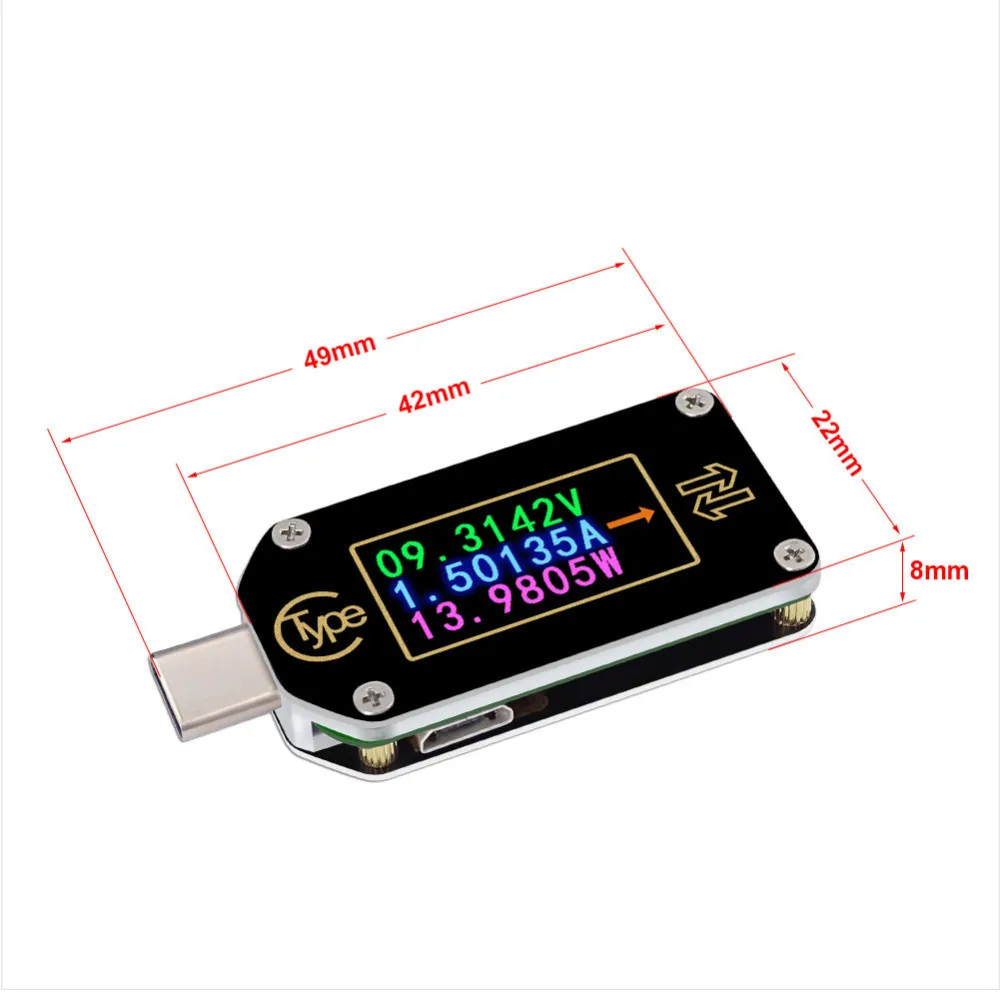 1. Технические параметры: Модель: TC66/TC66-C Экран дисплея: 0,96 дюймовый цветной IPS дисплей Диапазон измерения напряжения: 0,005-30,0000 в Разрешение измерения напряжения: 0,0001 в (0.1мв) Диапазон измерения тока: 0-5.00000A Разрешение измерения тока: 0.00001A (0.01mA) Напряжение питания: 3,5-24 В Разрешение экрана: 160*80 Диапазон емкости: 0-99999 мАч Точность измерения напряжения: ± (0.05% + 20 цифр при 23 °C) Диапазон аккумуляции энергии: 0-99999mWh 999.99Wh Точность измерения тока: ± (0.1% + 30 цифр, при 23 °C) Диапазон сопротивления нагрузки: 1Ω-9999.9Ω Диапазон измерения мощности: 0-150 Вт Диапазон измерения температуры: 0 °C ~ 80 °C/32 °F ~ 176 °F Частота обновления: 2 Гц Диапазон рабочих температур: 0 ~ 45 °C/32 °F ~ 113 °F Автоматическое выключение экрана: 0-9 минут Размеры: 49 мм x 22 мм x 8 мм Режим быстрой зарядки: QC2.0, QC3.0, APPLE 2.4A/2.1A/1A/0.5A, Android DCP, SAMSUN Товары включают:Тестер * 1
