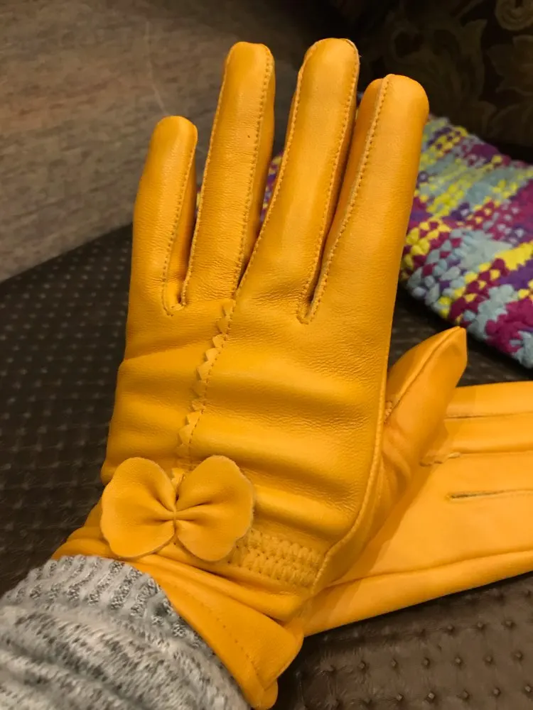 Перчатки за свою стоимость отличные! Цвет тёмно-синий прямо как мне надо было, жёлтые конечно хотелось рыжее, как на фото продавца. Чудо-бантики легко и просто отпороть можно, что я и сделала. На фото синие уже в нормальном виде. Надеюсь, проношу сезон, а то и два. И закажу ещё в другом цвете. Да, приехали достаточно быстро.