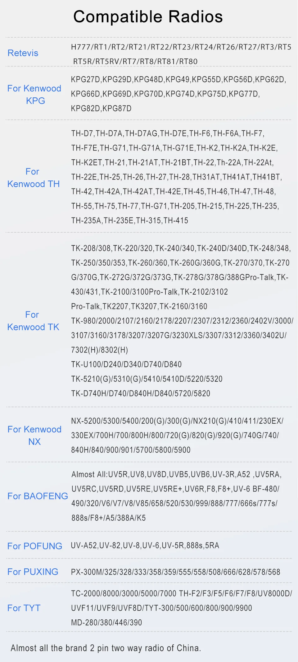 Почти все: UV5R,UV8,UV8D,UVB5,UVB6,UV-3R,A52 ,UV5RA,UV5RC,UV5RD,UV5RE,UV5RE +,UV6R,F8,F8 +,UV-6 BF-480/490/320/V6/V7/V8/V85/658/520/530/999/888/777/666s/777s/888s/F8 +/A5/388A/K5