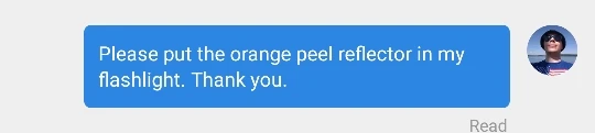 Заказ оплатил 2021-02-14, получил в отделении Новой Почты 2021-03-03. Почитал отзывы покупателей, что продавца если попросить - то он сменит без вопросов отражатель/рефлектор. Написал свою просьбу, чтоб гладкий рефлектор продавец заменил на рифлёный апельсиновой коркой. Сообщение было прочитано и проигнорировано, хотя на другие сообщения продавец отвечал охотно. Видимо, перебухал бедняга на свой новый год китайский, и с перепою забил болт...