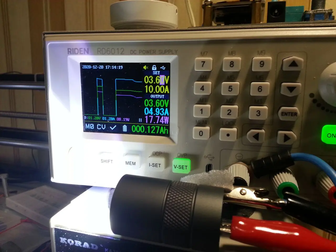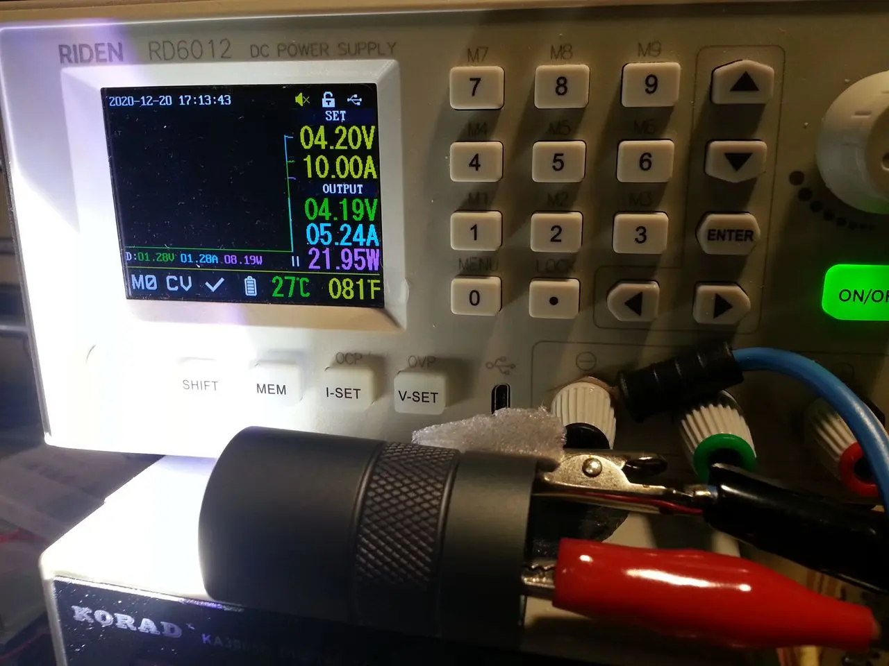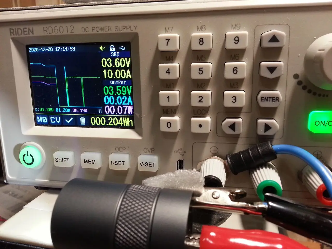 Фонарь огонь, светит огонь. 12 групп как оказалось в принципе не очень то и нужны. Пока вошёл в режим настройки чуть большой палец не отвалился. На максимальном режиме потребление чуть больше 5 ампер, которое держится примерно до 3.6 вольт на БП, дальше плавное снижение по мере разряда. ШИМ мерцания подручными методами(видеокамера) не обнаружено. Фото некоторых замеров, в режиме 0.1% БП ток не фиксирует), стоит вторая группа. ЗЫ греется как маленький сатана ещё бы 20 ватт на такой кусок люминия, до срабатывания термозащиты не доводил от греха по дальше.