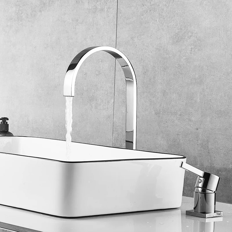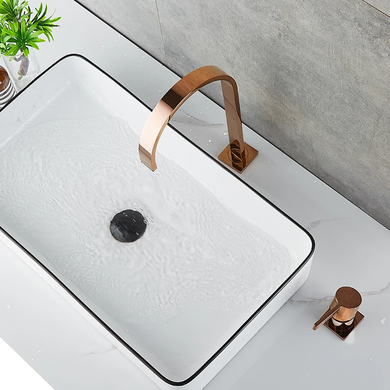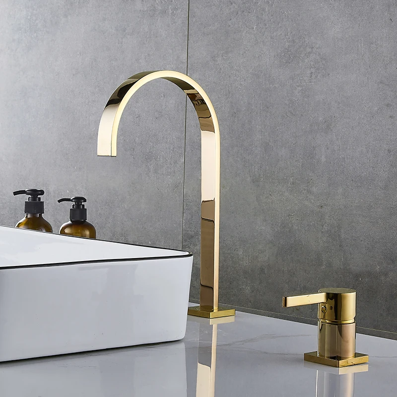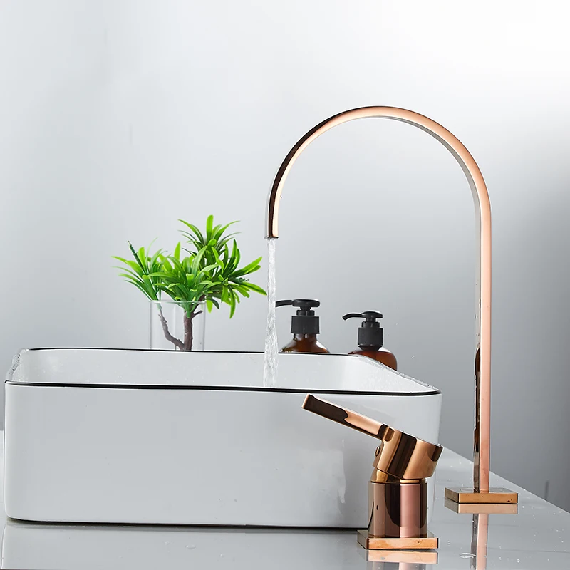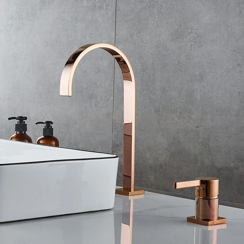 Смеситель для раковины из розового золота, Супердлинная труба с двумя отверстиями, широкий кран для ванной, поворот на 360 градусов, широкий кран для раковины