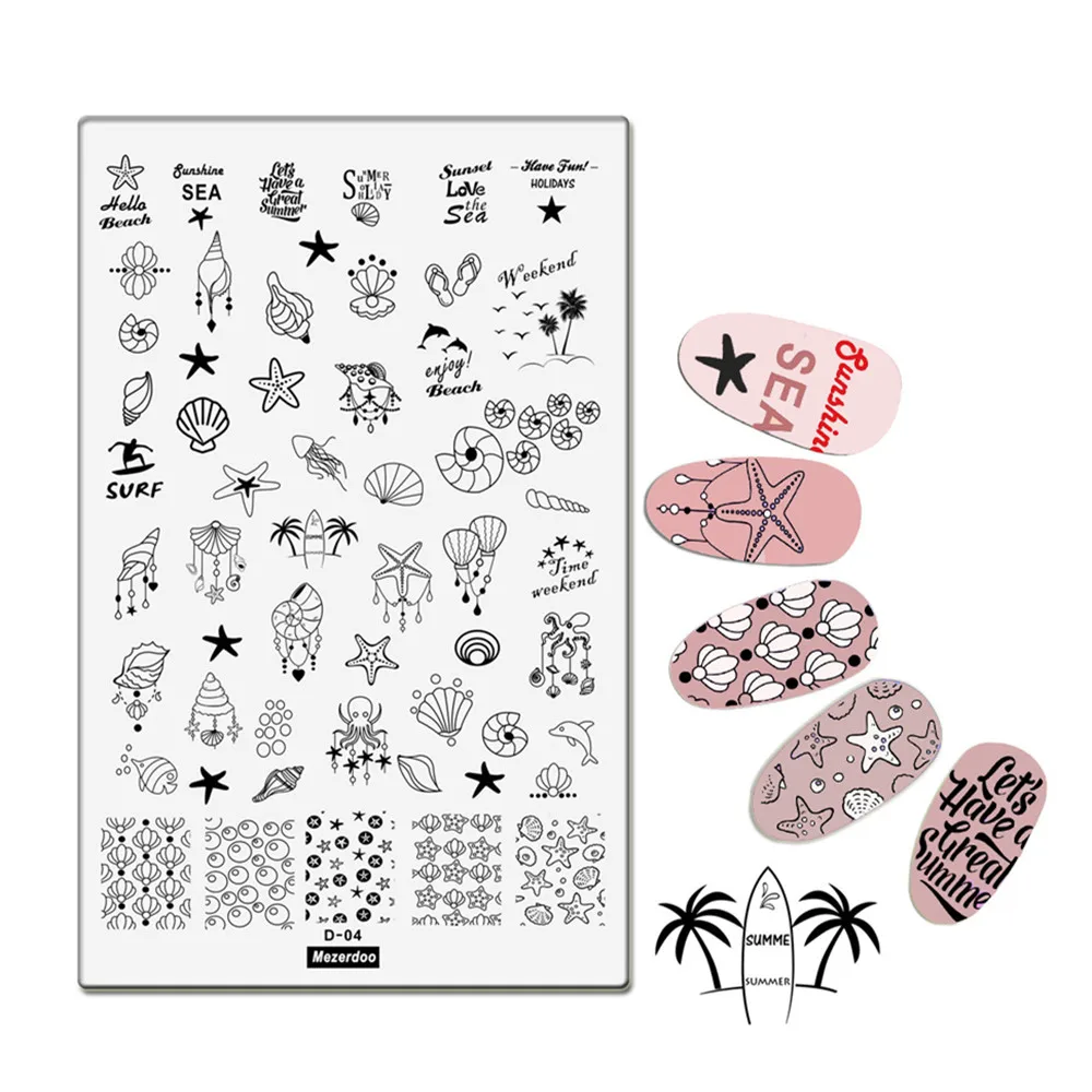 Шаблоны для стемпинга, летние шаблоны для стемпинга, ракушек, цветов, гвоздей, узоров, пальмовых деревьев, инструменты для ногтей Mezerdoo