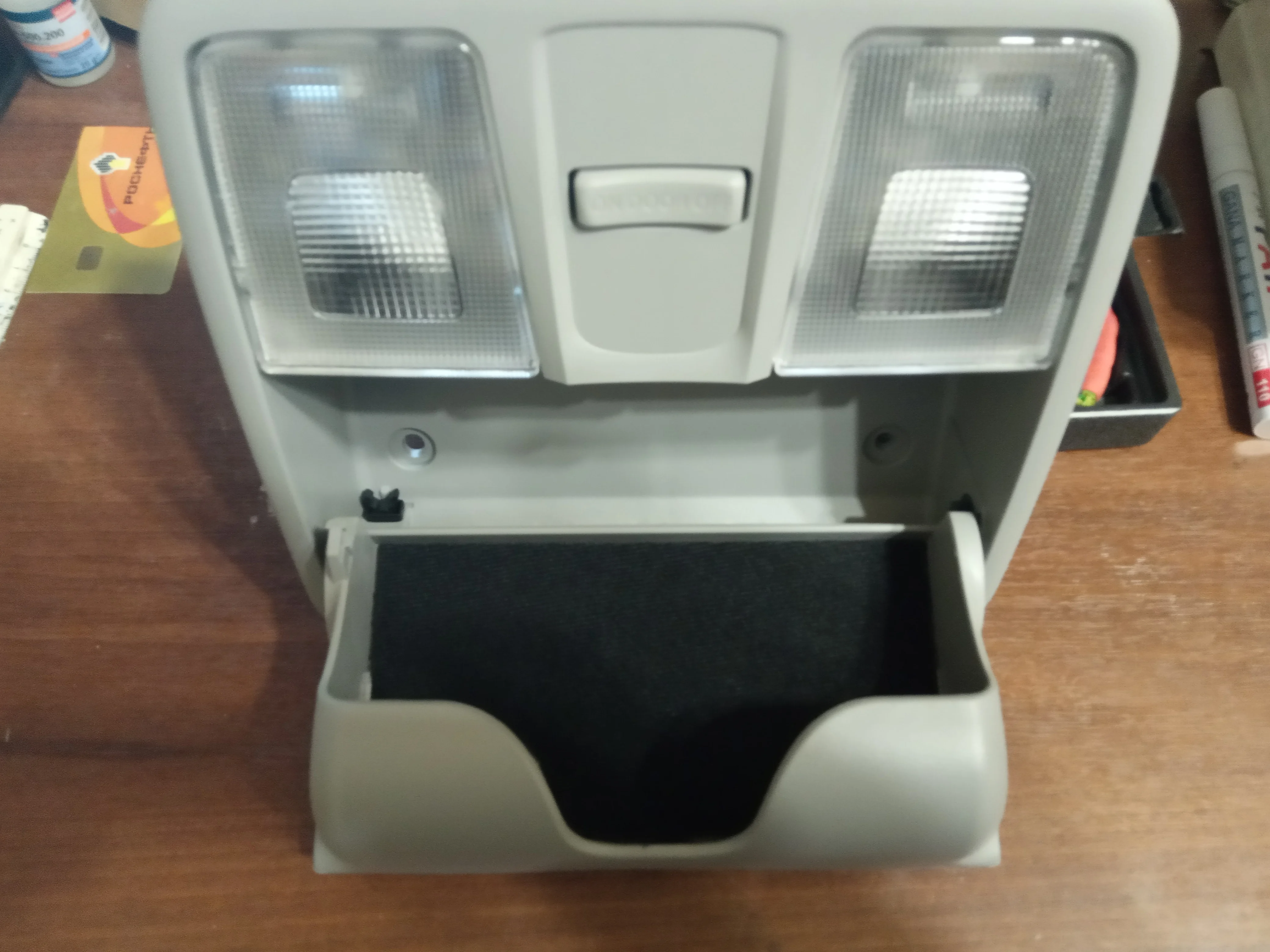 Отсутствует маркировка(928001Х000) на товаре. В целом хорошо. Но танцев с бубнами не удалось избежать при установке. Сначала изготовил шаблон. Отверстия для крепления не подходят для штатного кронштейна (покупал отдельно, код 928301R000), видимо рассчитаны на другой, практически сходятся с отверстиями в крыше. Болты заходят под углом,зазоров нет. По электрике - нужно перепиновать штекер идущий к плафону, иначе горит предохранитель. (Как перепиновать нашел в инете). Проводка которая шла с фонарем не пригодилась. Купленный кронштейн пригодился только для крепления проводки. Чтобы не гремели очки, внутреннее пространство оклеил карпетом. Все работает, света мне кажется стало больше, т.к. кнопки целиком из прозрачного пластика в отличии от оригинальных. На мой взгляд пластик качественный, не хрупкий(хотел разобрать емкость для очков чтобы удобно клеить карпет, не смог и ничего не сломал). Этот аналог вполне радует. В целом то что я видел на картинке, то я и получил. Продавцу спасибо!