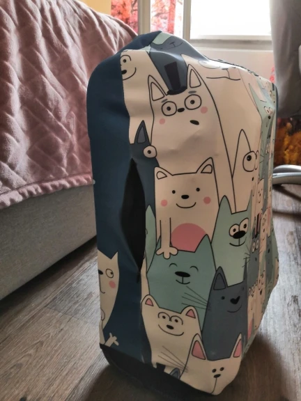 Доставлено за 2 недели в Сургут. Качество хорошее, ткань плотная. Внизу молния, в боковых швах с обеих сторон тоже молния, наверху 2 отверстия под ручки. Размер моего чемодана: 48*35*20 см. Подошло с небольшим запасом. Спасибо продавцу!