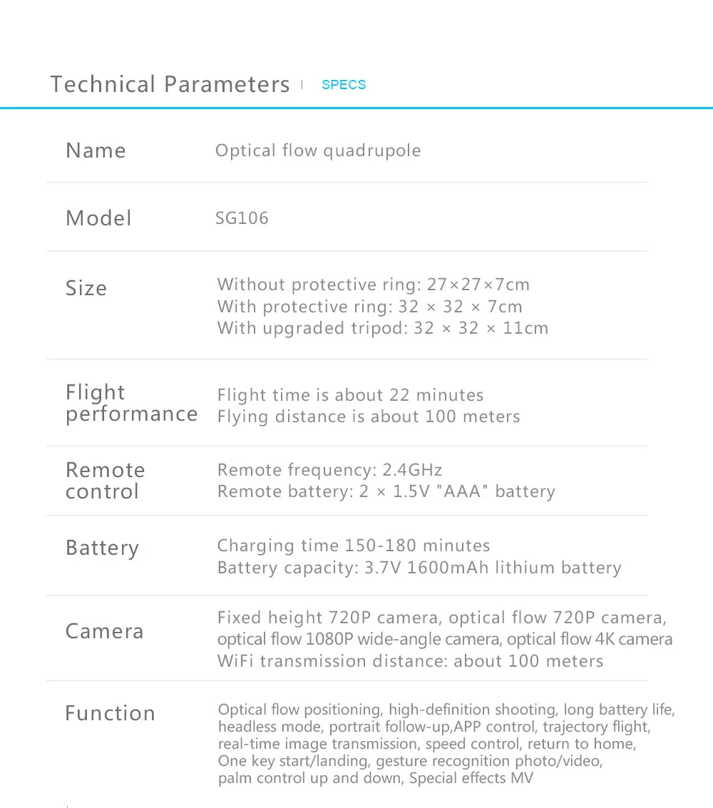 Функция: вверх/вниз, вперед/назад, поворот влево/вправо, боковой светильник f, светодиодный светильник, Безголовый режим, автоматический возврат одной кнопки, оптическое позиционирование потока, светильник Track F, режим удержания высоты, фото жестов, видео жестов