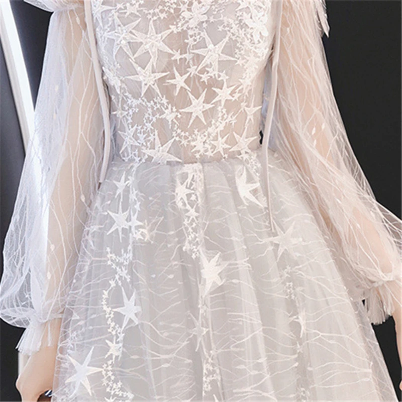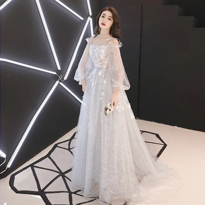 Платье в пол для выпускного это Yiiya, платье для вечеринки серого цвета, цвета шампань, с вырезом лодочкой, пышными рукавами, трапециевидного силуэта, наряды больших размеров, со звездами, E428, 2019