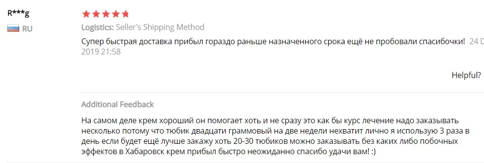 заказ получила до Саратовской области шла посылка полтора месяца..крем пришел как на фото соответствует описанию.о результате напишу позже помогает или нет