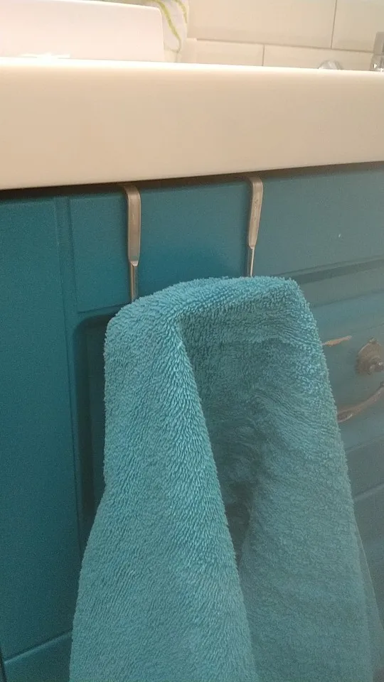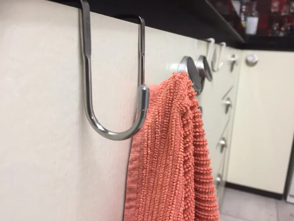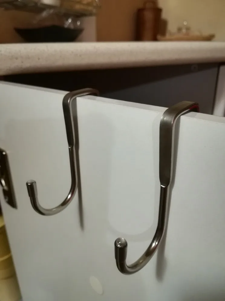 Аккуратные крючки, на мою маленькую дверцу в кухонном шкафчике сели идеально. Полотенца на них не мешают двери открываться.