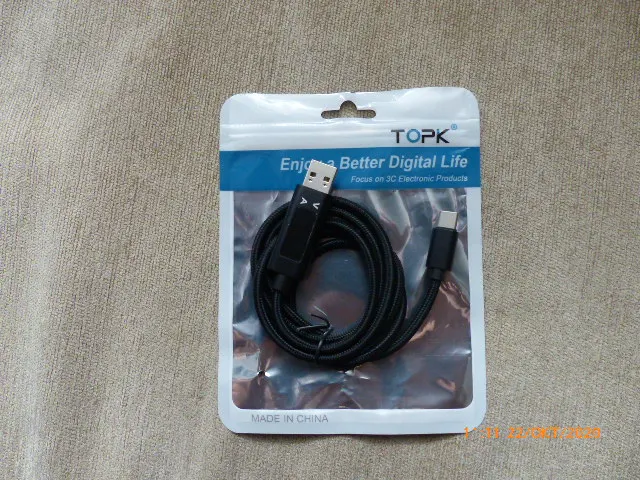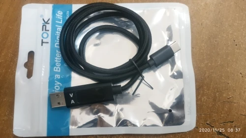 Посылка пришла через 22 дня, в фирменном пакетике TOPK в котором ещё один застёгивающийся пакетик с кабелем. Кабель на вид качественный, в тканевой оплётке, и довольно прочный. Разъём вставляется плотно, не шатается и не вываливается. Индикатор светится красным цветом, попеременно отображая то напряжение, то ток, примерно по секунде на каждое показание. В общем, рекомендую - очень удобные кабели - сразу видно заряжается смартфон или нет, и видно работает быстрая зарядка или обычная.