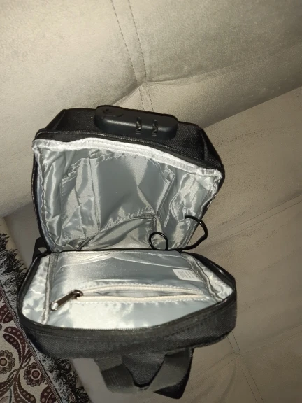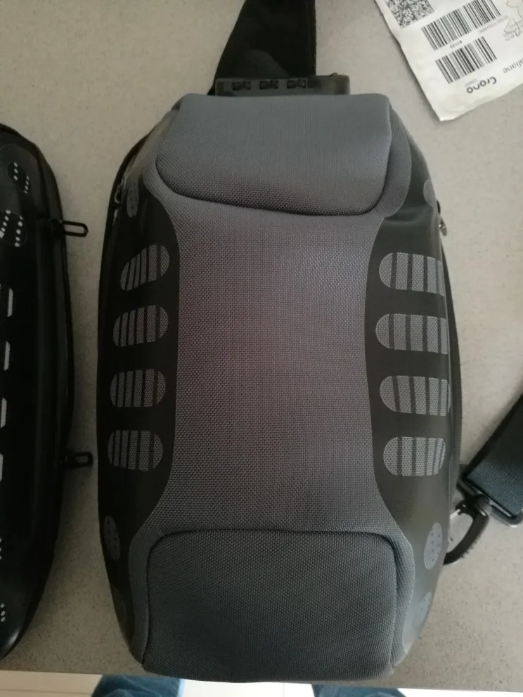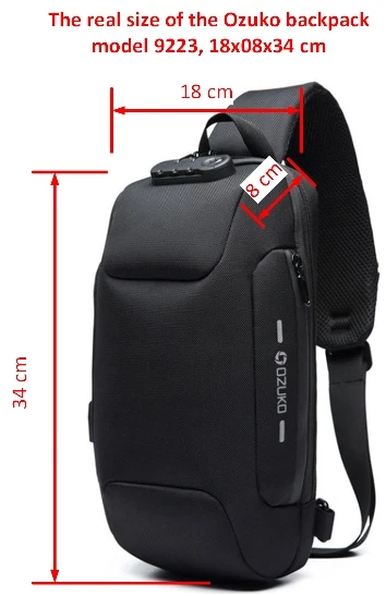 Рюкзак понравился качеством пошива. Материал плотный и хорошо держит форму. Размер модели Ozuko 9223 на странице указан как 18х10х35см. Реальный 18х08х34см по внешней стороне как в других магазинах этой модели. Литровый термос высотой 33см входит впритык. С ним замок закрывается с небольшим усилием. Нужен был минимум 35см по высоте как в описании. В потайной карман на спинке не вмещается паспорт. Во внутренний карман с замком тоже. В боковой карман можно положить телефон c размером экрана 5,5 дюймов. С экраном 6,67 не вмещается. В ремне имеется глубокий карман для пластиковой карты без замка или хотя бы липучки. При стянутом в минимум ремне рюкзак на спине висит низко. Приходится узкую часть ремня складывать вдвое и фиксировать скотчем, чтобы рюкзак висел прямо за лопатками. Логотип немного другой без фирменного круга как на фото в странице описания товара. Перед отправкой из рюкзака вынули пузырь от деформации, чтобы уменьшить объем посылки и сняли картонную бирку.