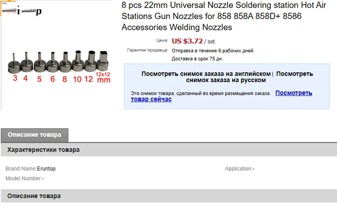 Заказал 13 ноября 2020 года. На 110-ый день (из них 88 суток товар находился в Харбине, КНР) 2 марта 2021 года посылка всё-таки прибыла на почту в Барнаул. Всё целое, но вместо заказанного сопла ф10 продавец положил в набор к имеющемуся в заказе соплу ф8 ещё одно сопло ф8, но короткое (явно из другого набора). На фото это видно по указке. Вероятно в магазине сопло ф10 было только для рекламного фото. Хорошо, что остальные сопла в наборе из 8 шт оказались не одного диаметра.