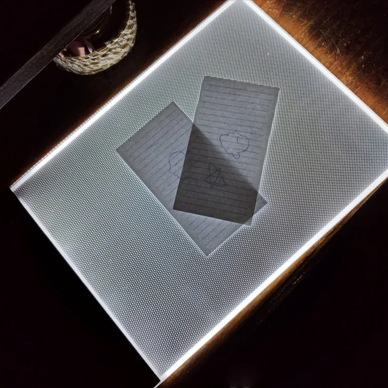 Мне очень нравится и идея такой доски и исполнение! То, что раньше делалось (копирование картинки) на стекле с лампой или на оконном стекле сейчас удобно на рабочем столе. Прозрачный пластик(не стекло), легкий, аккуратный, тонкий, с подсветкой - ничего лишнего. Очень довольный покупатель! Большое спасибо!
