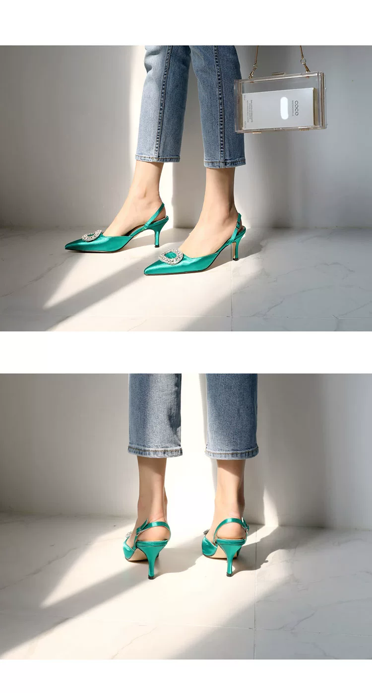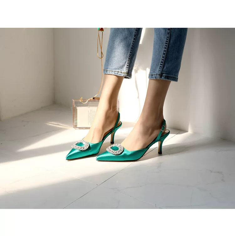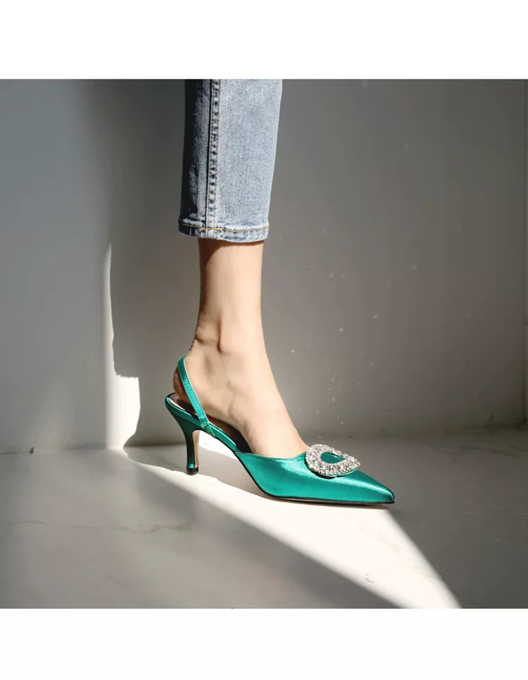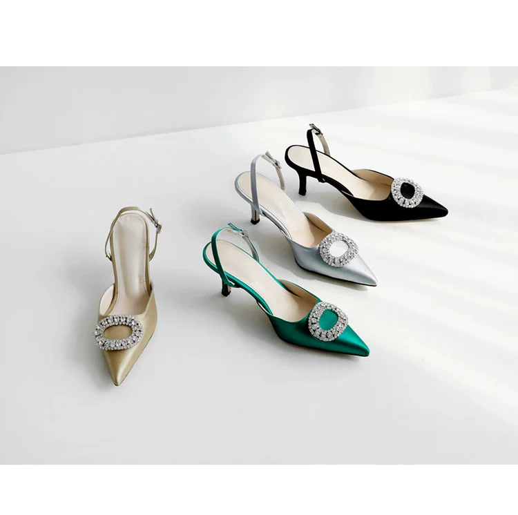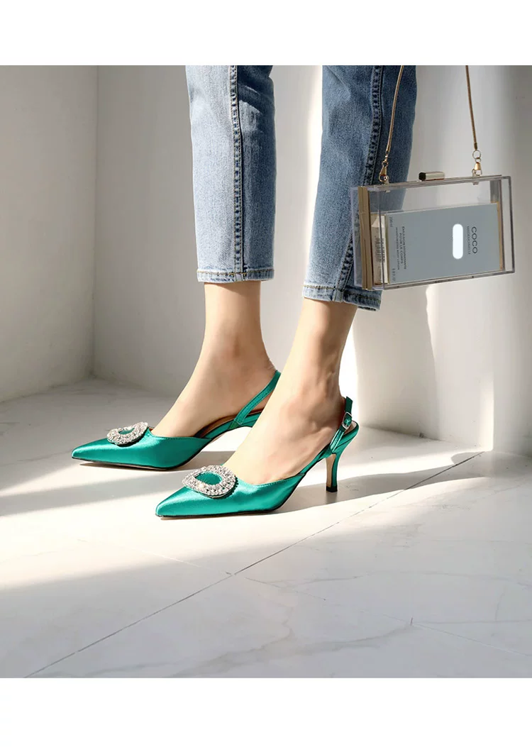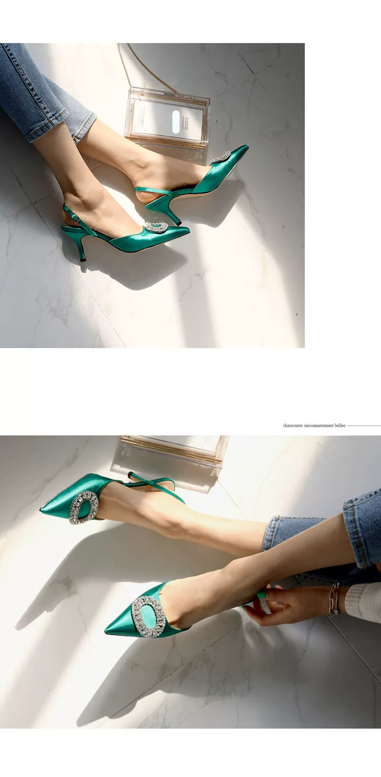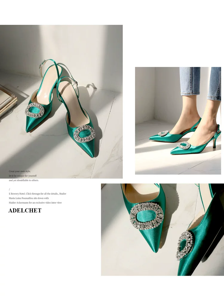 Босоножки женские атласные, с острым носком, на высоком каблуке, с пряжкой