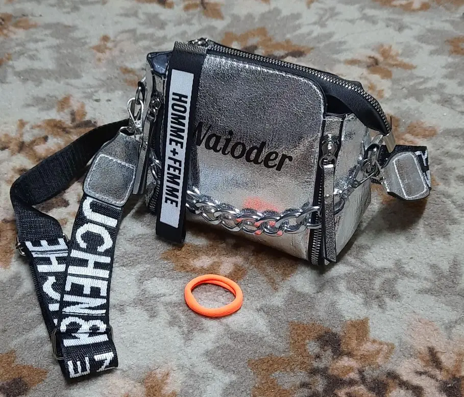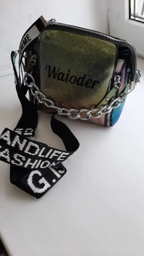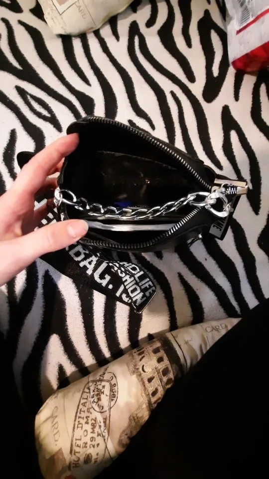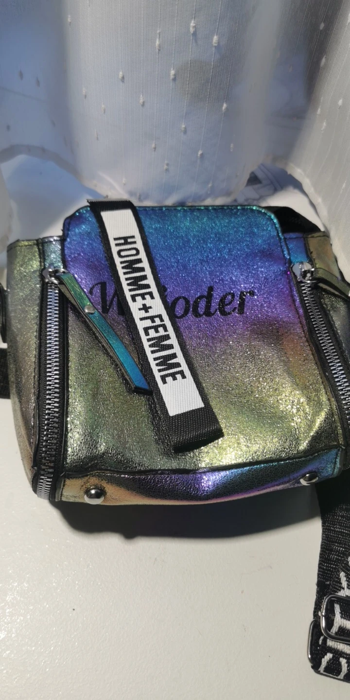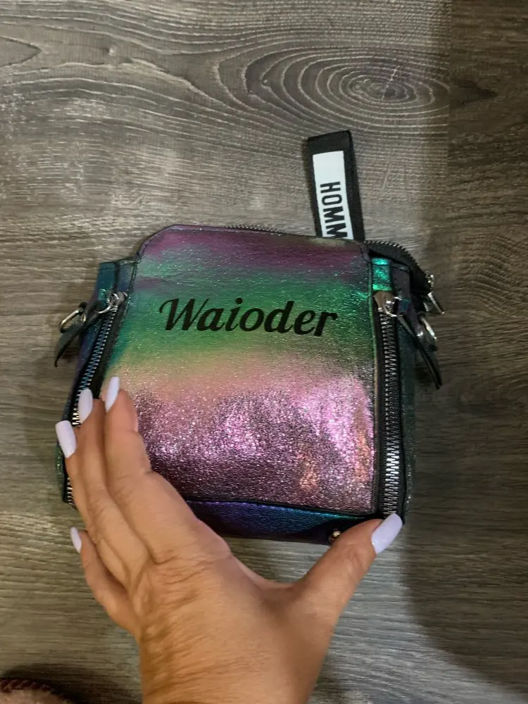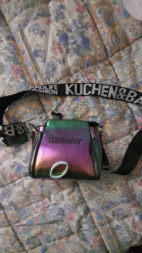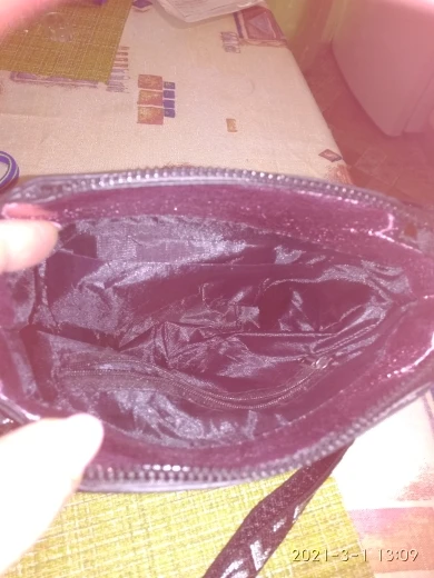сумочка меньше чем я ожидала, но довольно вместительная, есть маленький кармашек внутри, на солнце безумно красиво переливается , продавец положил резинки и записку мелочь а приятно