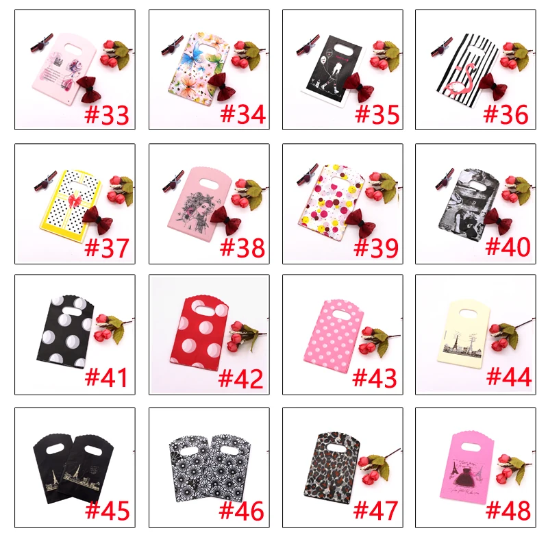 50 шт.лот несколько дизайнов маленький пластиковый пакет 9x15 см бутик Подарочный пакет с ручками Красивые Подвески Серьги Упаковочные пакеты для ювелирных изделий