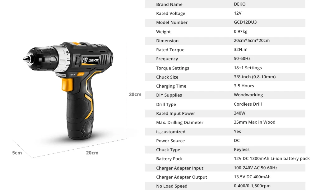 DEKO GCD12DU3 12 вольт макс литий-ионный Батарея 32N.m 2-Скорость э...