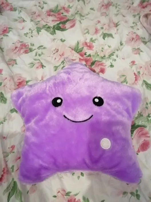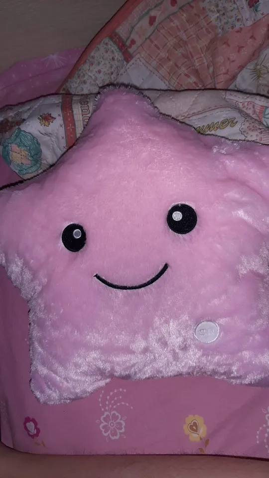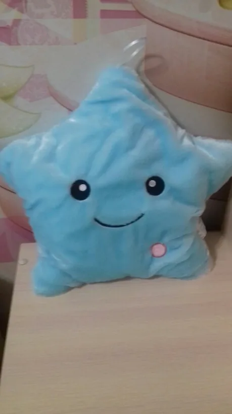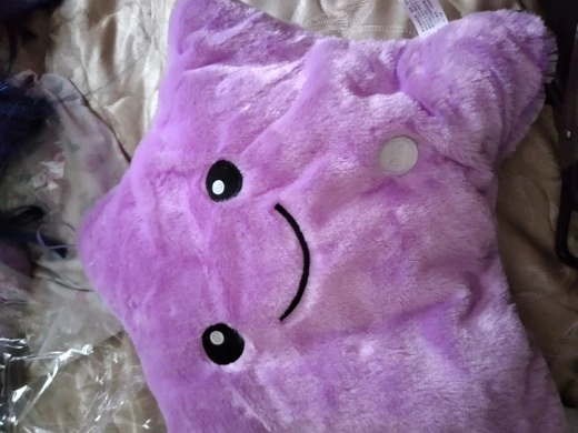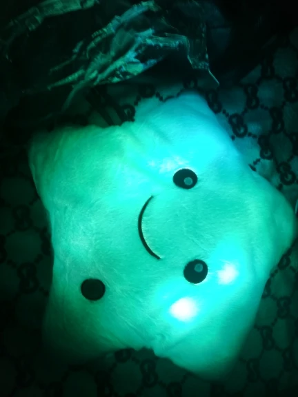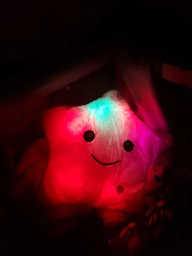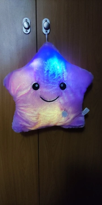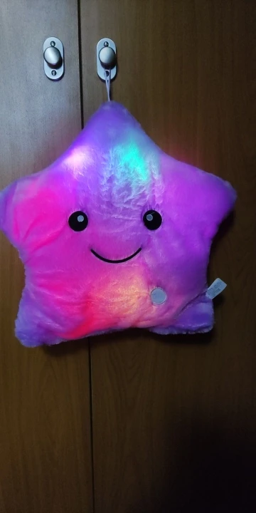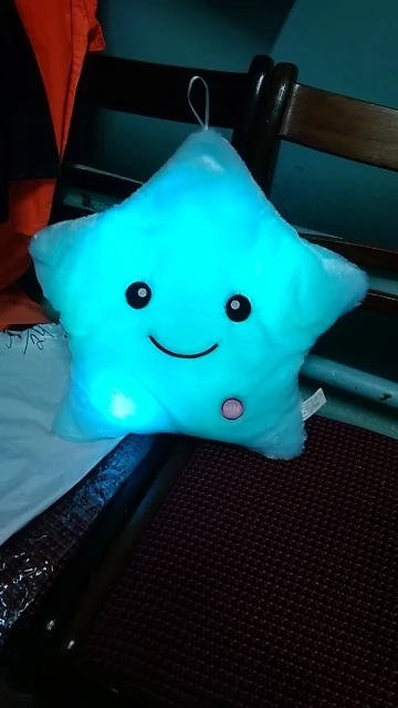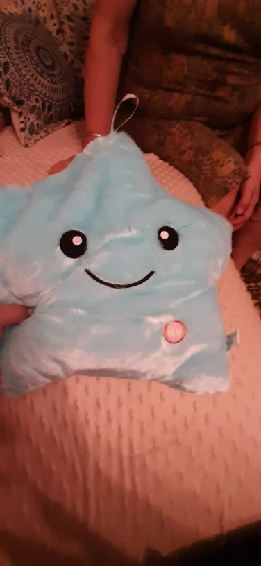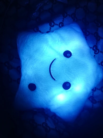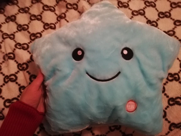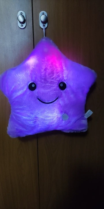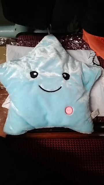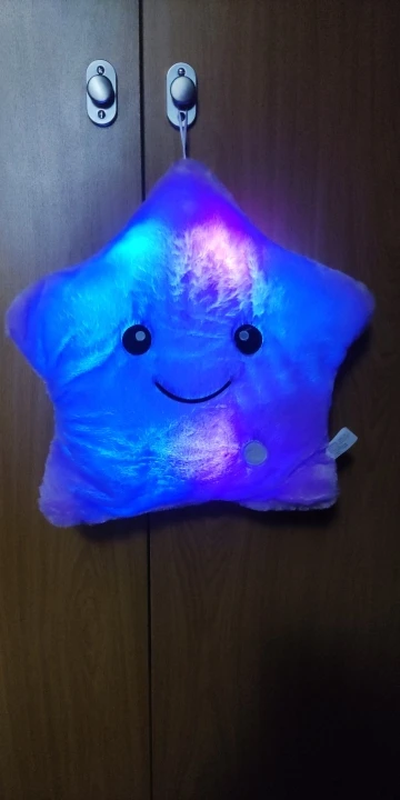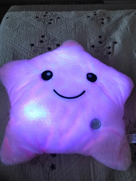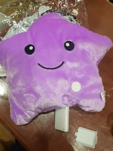 Очень красивая подушка. Очень мило. Я купил его в розовом цвете для своей дочери. Она в восторге. Батареи (3 батареи 1,5 В) не предоставляются, но это не имеет значения. Нет запаха пластика. Он прибыл хорошо упакован и довольно быстро (сроки были выполнены). Спасибо.