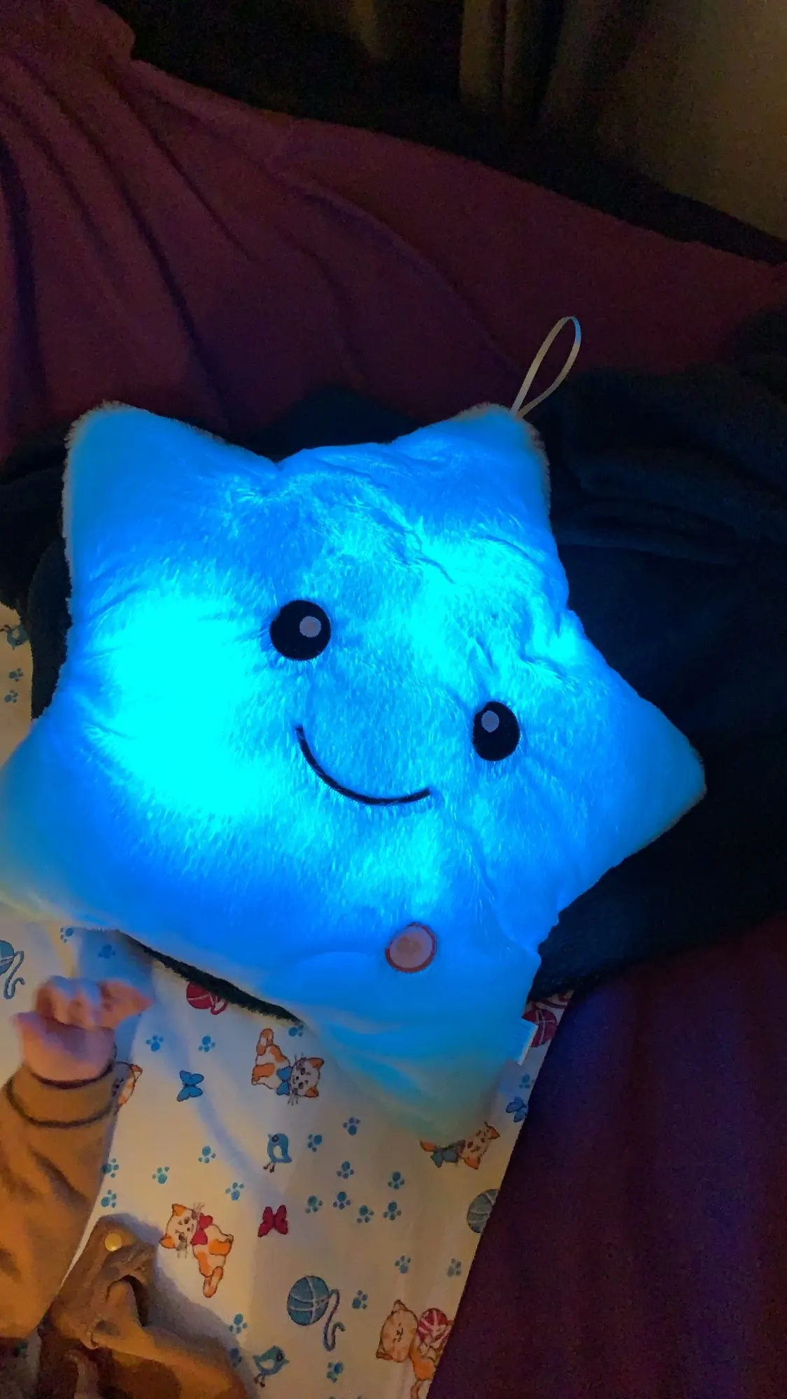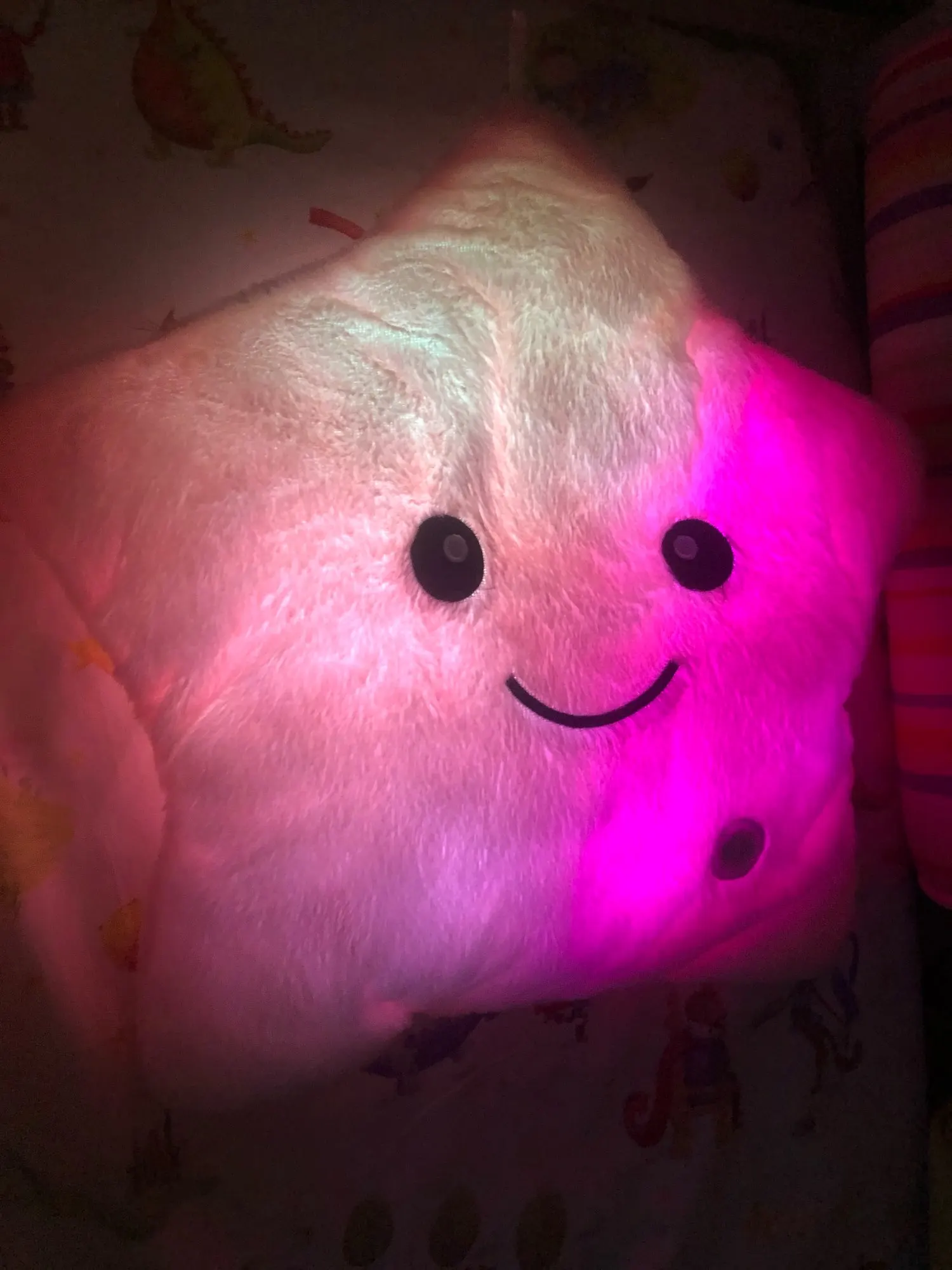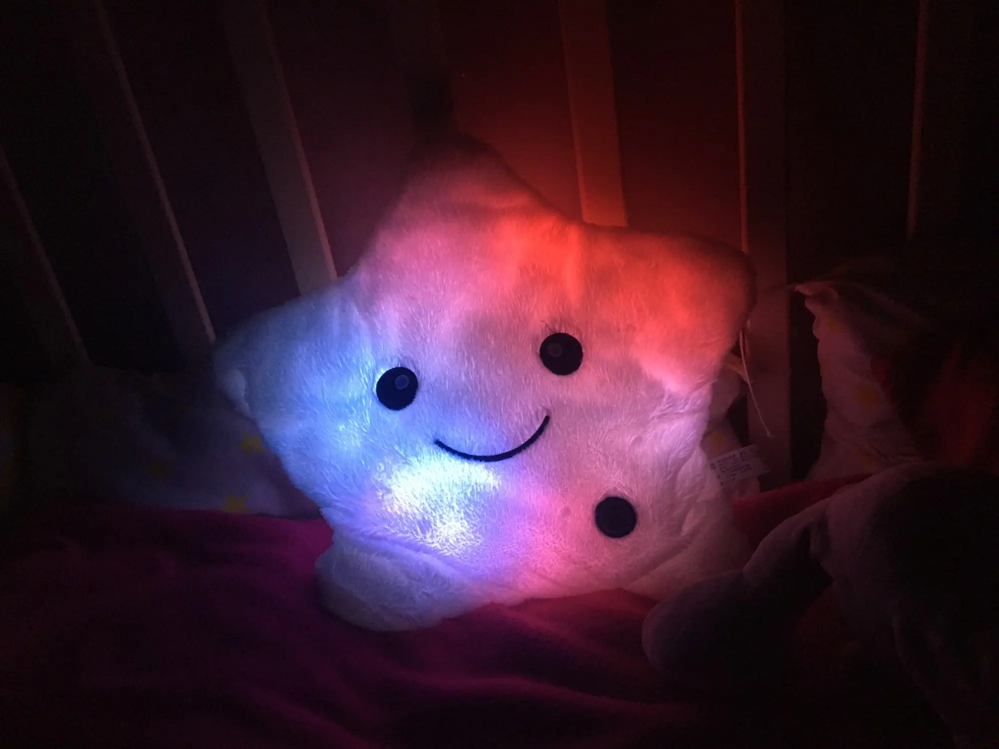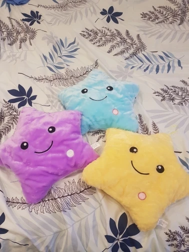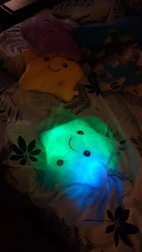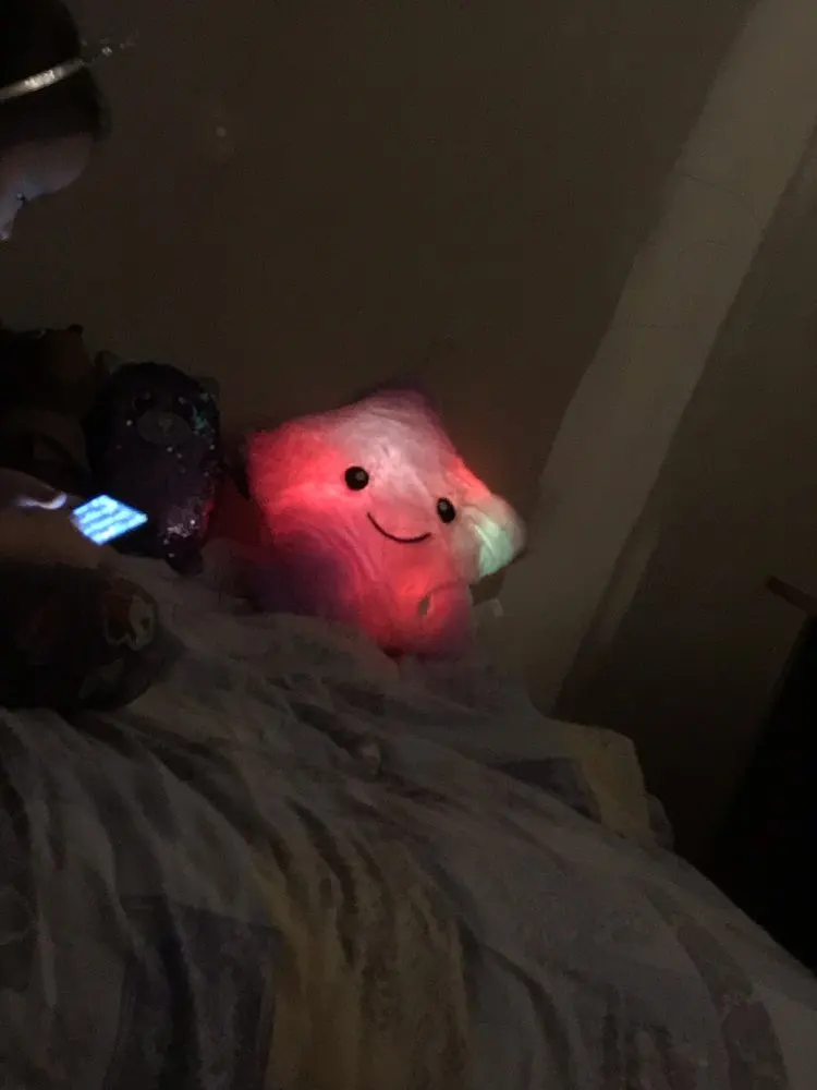 Очень красивая подушка. Очень мило. Я купил его в розовом цвете для своей дочери. Она в восторге. Батареи (3 батареи 1,5 В) не предоставляются, но это не имеет значения. Нет запаха пластика. Он прибыл хорошо упакован и довольно быстро (сроки были выполнены). Спасибо.