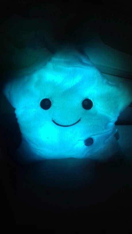 Подушка супер, будем заказывать ещё. Светится разными цветами. На ощупь как плюшевая игрушка, мягкая приятная, ребенку нравится на нее смотреть. Она как ночник) освещает и кроватку и комнату! Удобный регулятор кнопочка вкл. и выкл. подсветки. Батарейный блок спрятан на липучке в подушке, батарейки приобретаем отдельно) все очень аккуратно сшито. Цвета горят сами не останавливаясь, пока не отключить. Товар полностью соответствует описанию. Рекомендую к покупке. Так же отличный подарок для детей ! Товар до Питера дошел меньше 2 недель.