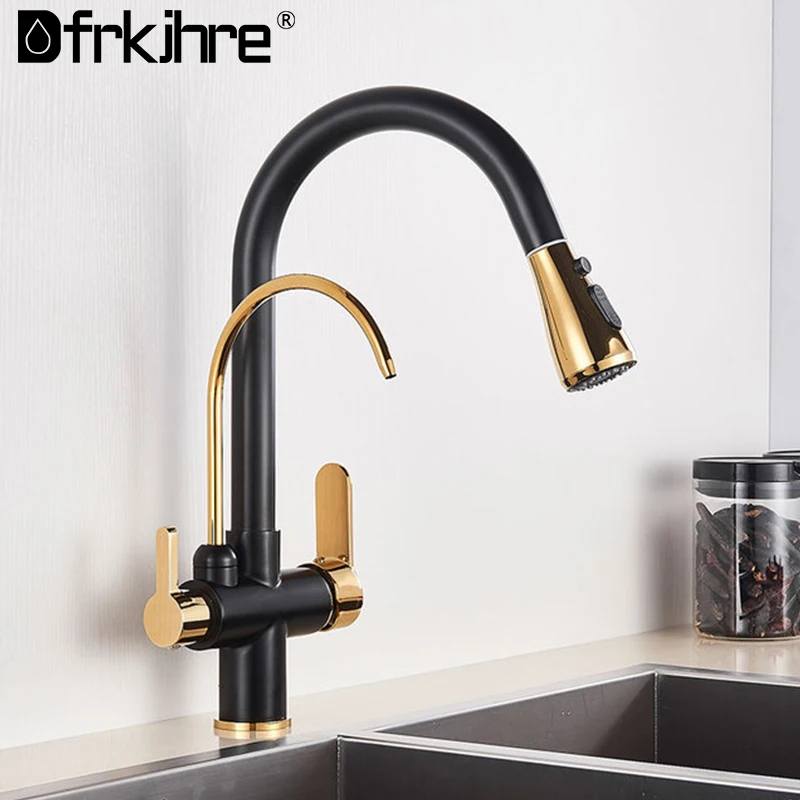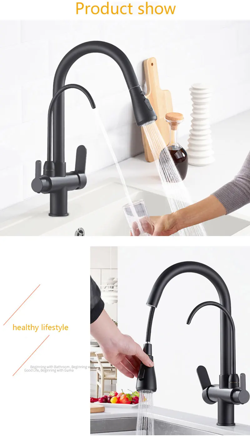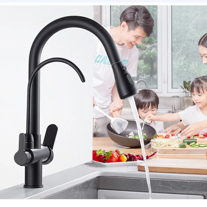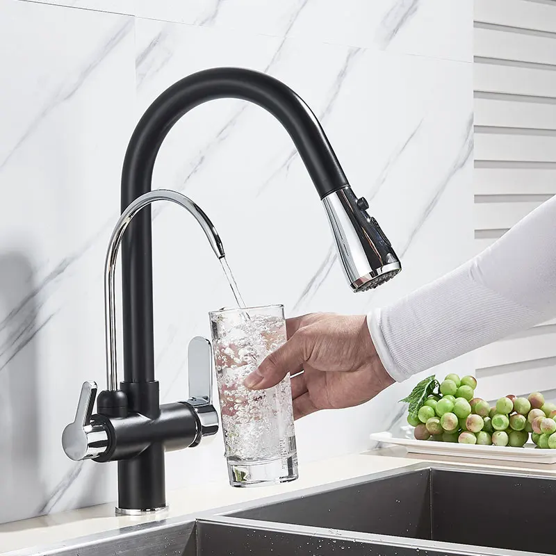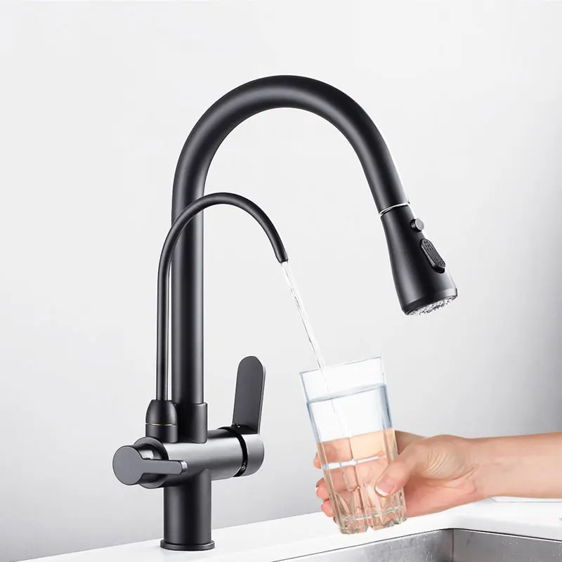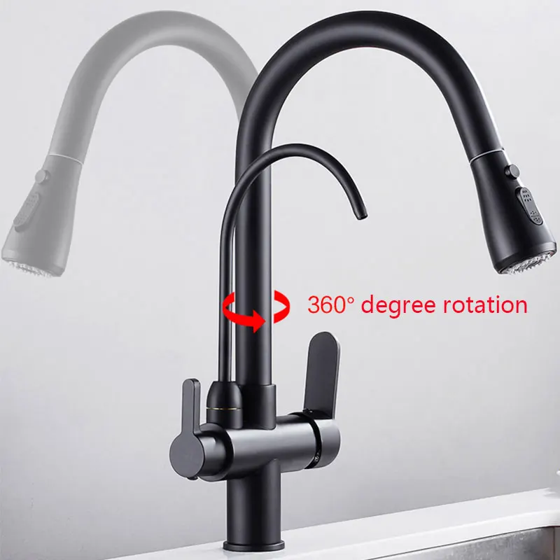 Матовый черный кран с фильтром для кухни, выдвижной смеситель с вращением на 360 градусов, тройной, для кухонной мойки