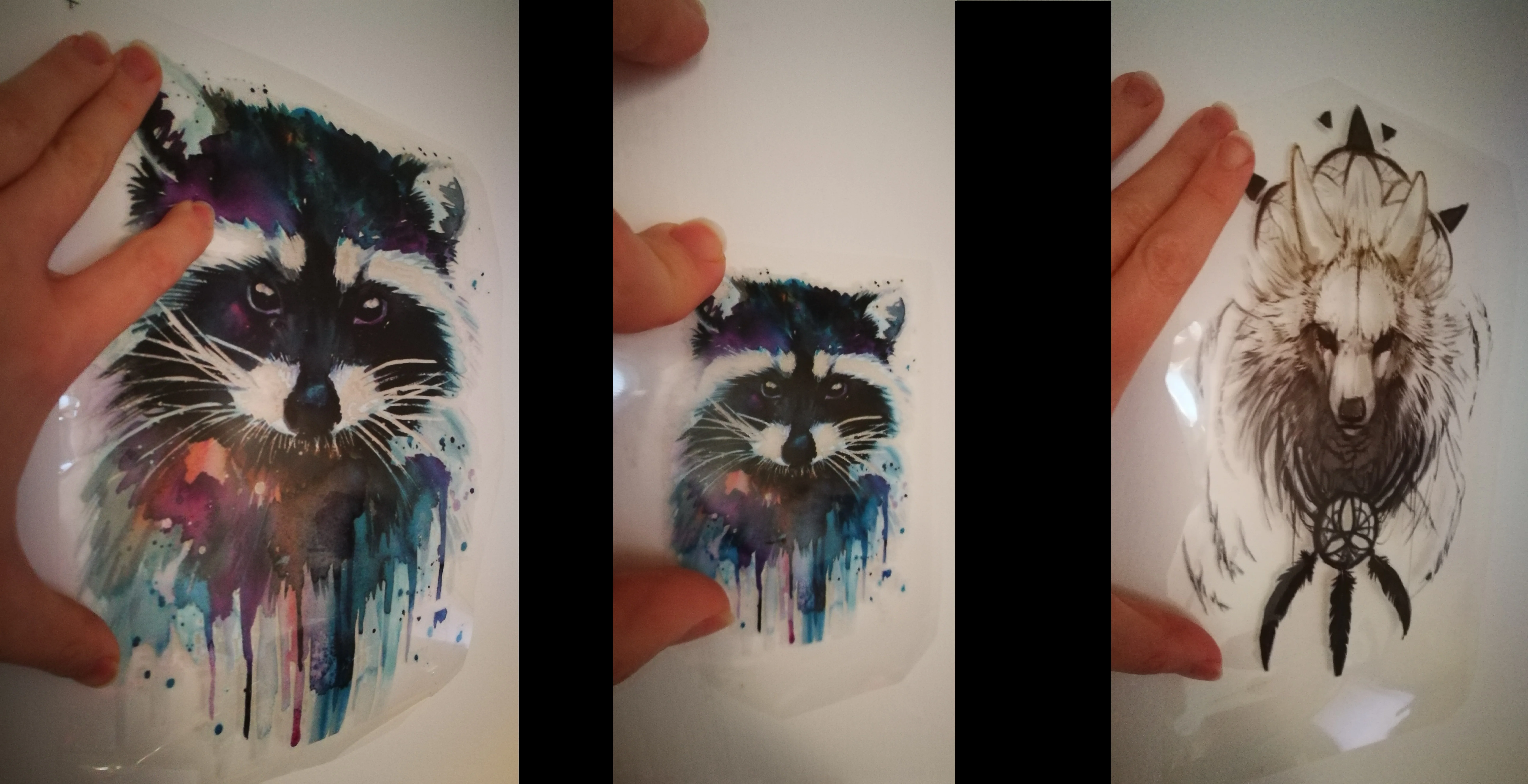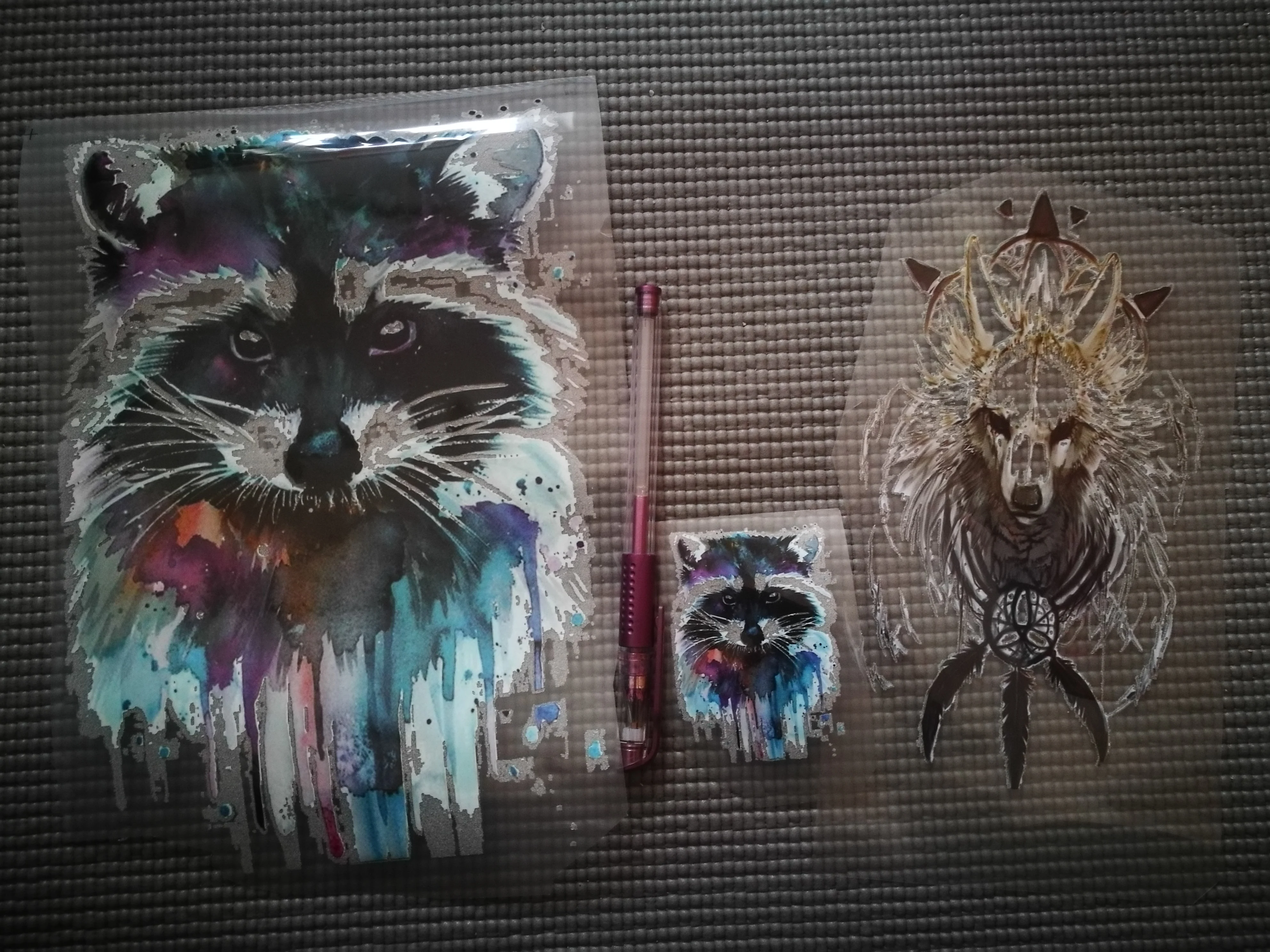 Item arrived quick, ordered a big racoon, a small one and the white wolf. It came safely rolled around a styrofoam tube. The big and small racoon are cute and the colors are nice, and in all orders the sizes are correct. The white wolf has grey, not blue undertones though and it's cutout in the forehead and ears (you can see that in pictures that don't have a white background), but I've noticed that another buyer got the same "mistakes", so I assume it's part of the design. Haven't applied it anywhere yet.