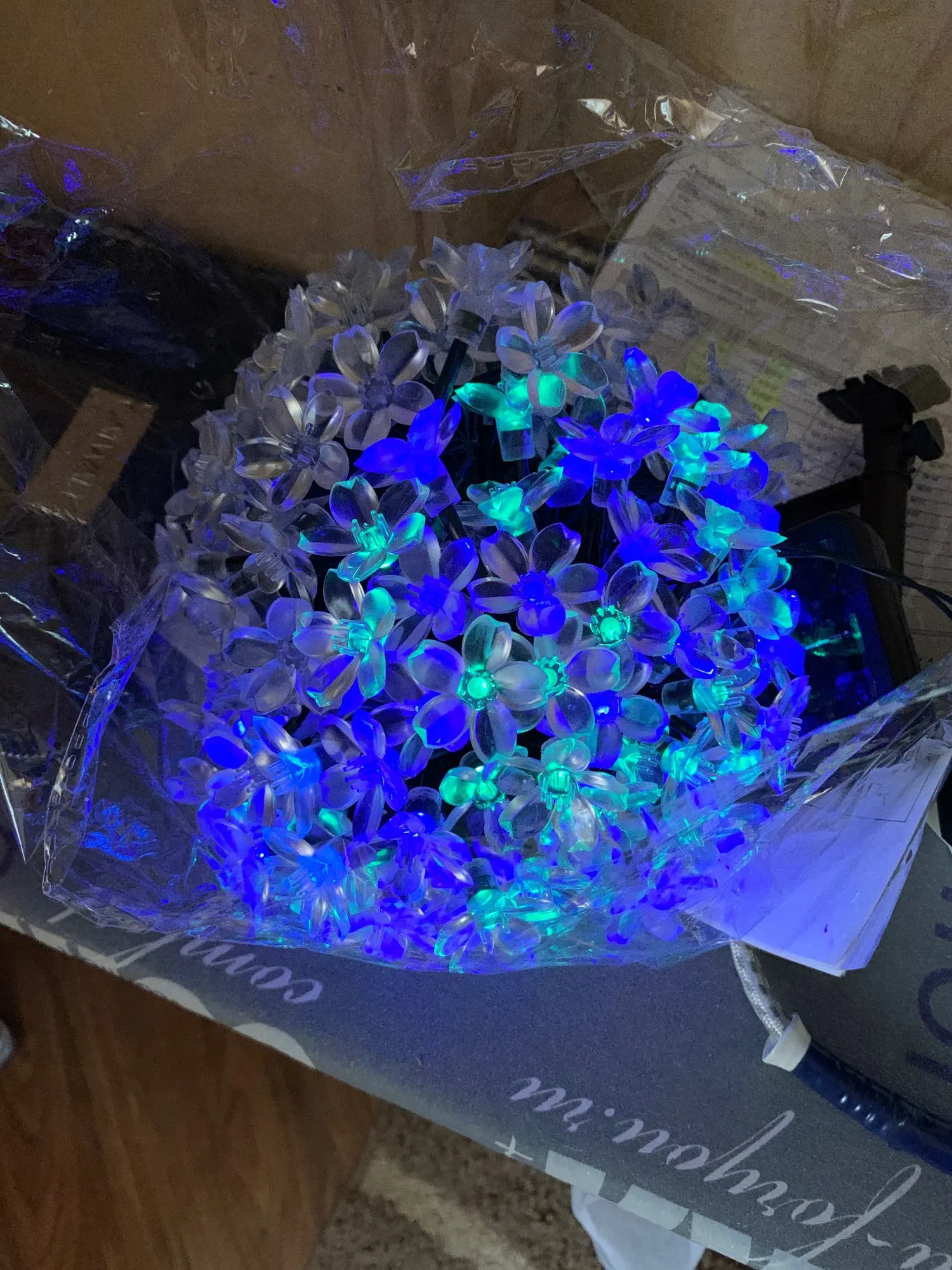 Доставка очень быстрая. 10 дней до Мск (в дни глобальной распродажи). Но, всего два режима гирлянды. Мигающий и непрерывно светящийся. До этого брал Пчёл, там все режимы как на новогодней гирлянде. Цветочки силиконовые, возможно в саду могут помутнеть от солнца. Но не факт. Своих денег стоит. 5 метров мало. Там всего 20 цветочков. Берите длиннее. В полной темноте очень красиво.