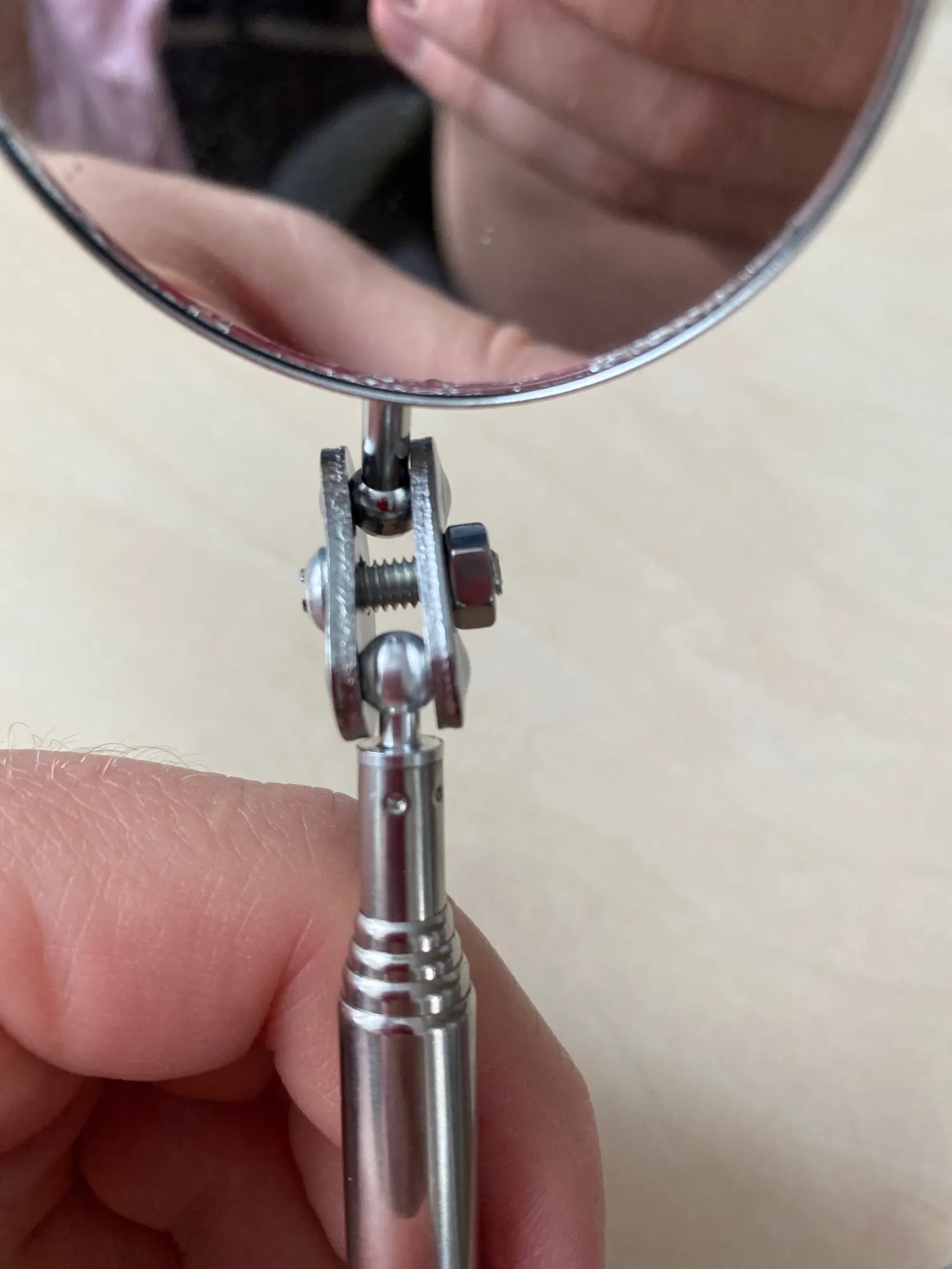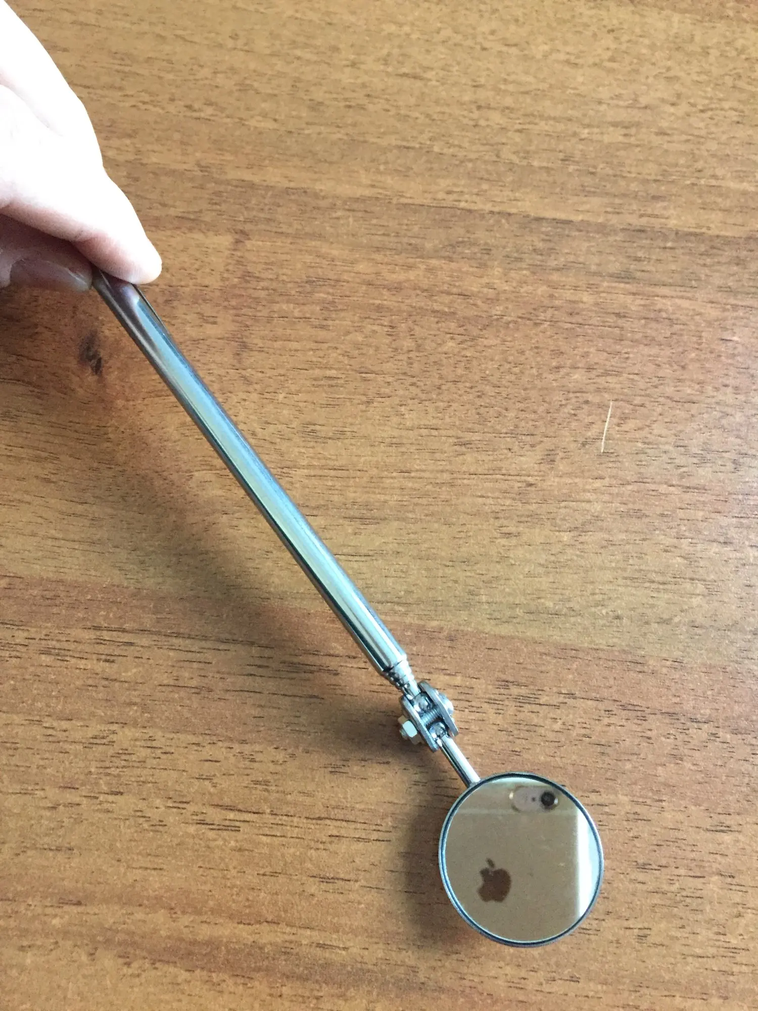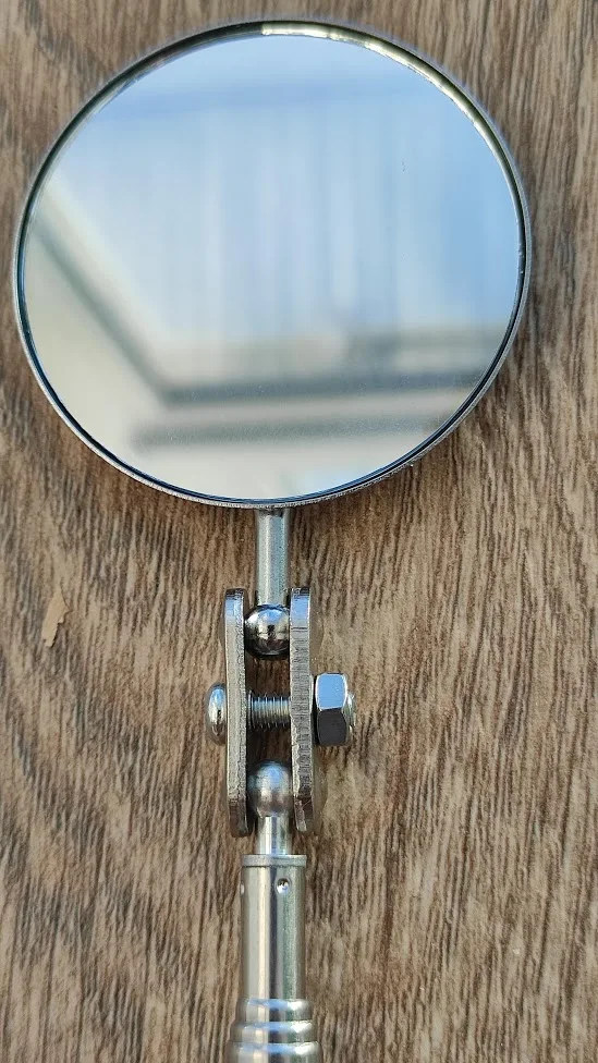 На самом деле простое крепкое зеркало. Поворачивается вокруг оси ручки и сгибается под любым углом. Два шарнира.