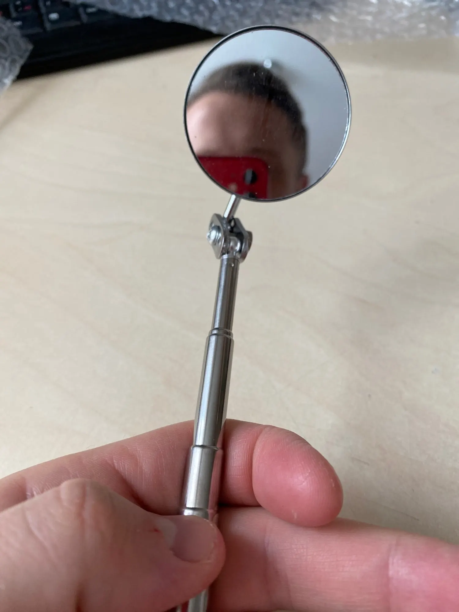 Доставка до Владимира за месяц. Упаковано неплохо, а вот качество сборки немного хромает, само зеркало крепиться к шарниру под углом небольшим. Но в целом полезная телескопическая штука.