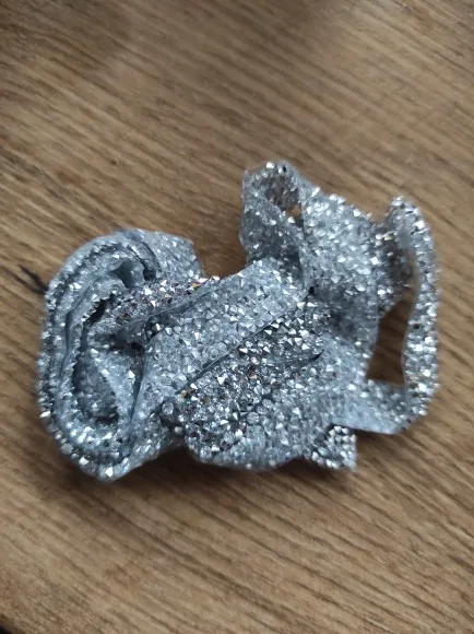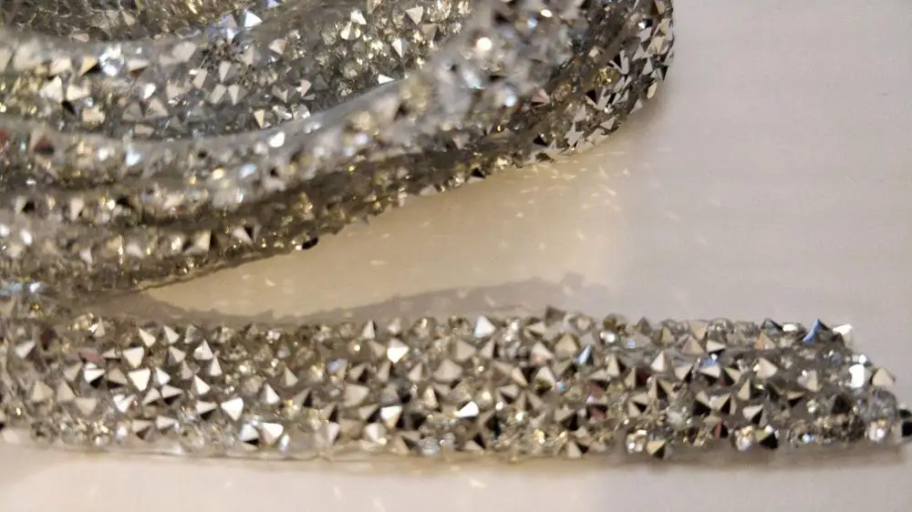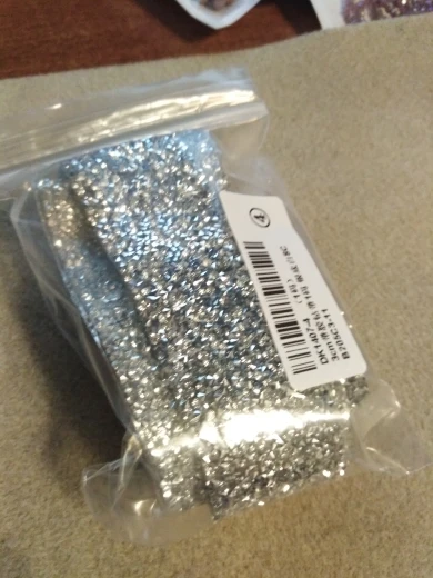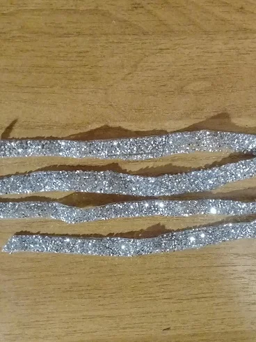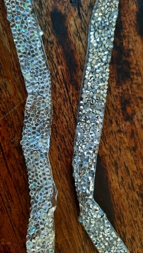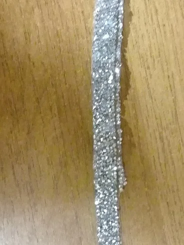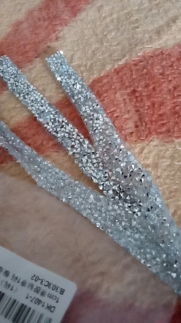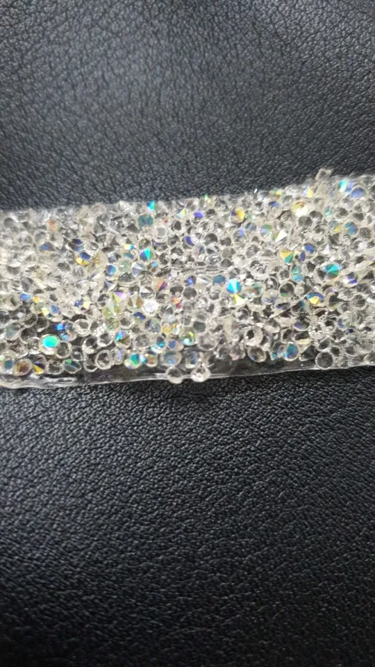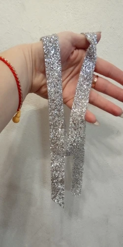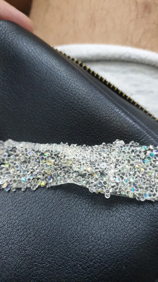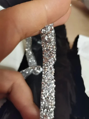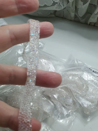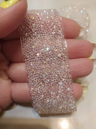 на самом деле на ленте в основном приклеены обычные прозрачные стразы и кое где блестящие. товар был весь мятый. на картинке показано в рулоне,а на самом деле прислали просто в кучу скомканное. больше у этого продавца не закажу. разматывала 30 минут тк все склеилось и при разборе стразы отвалились частично.