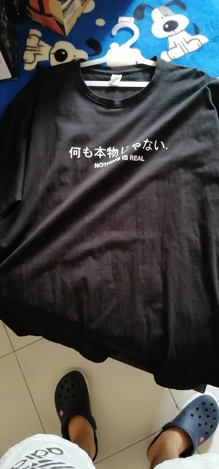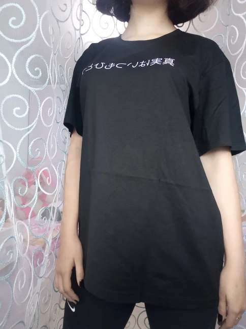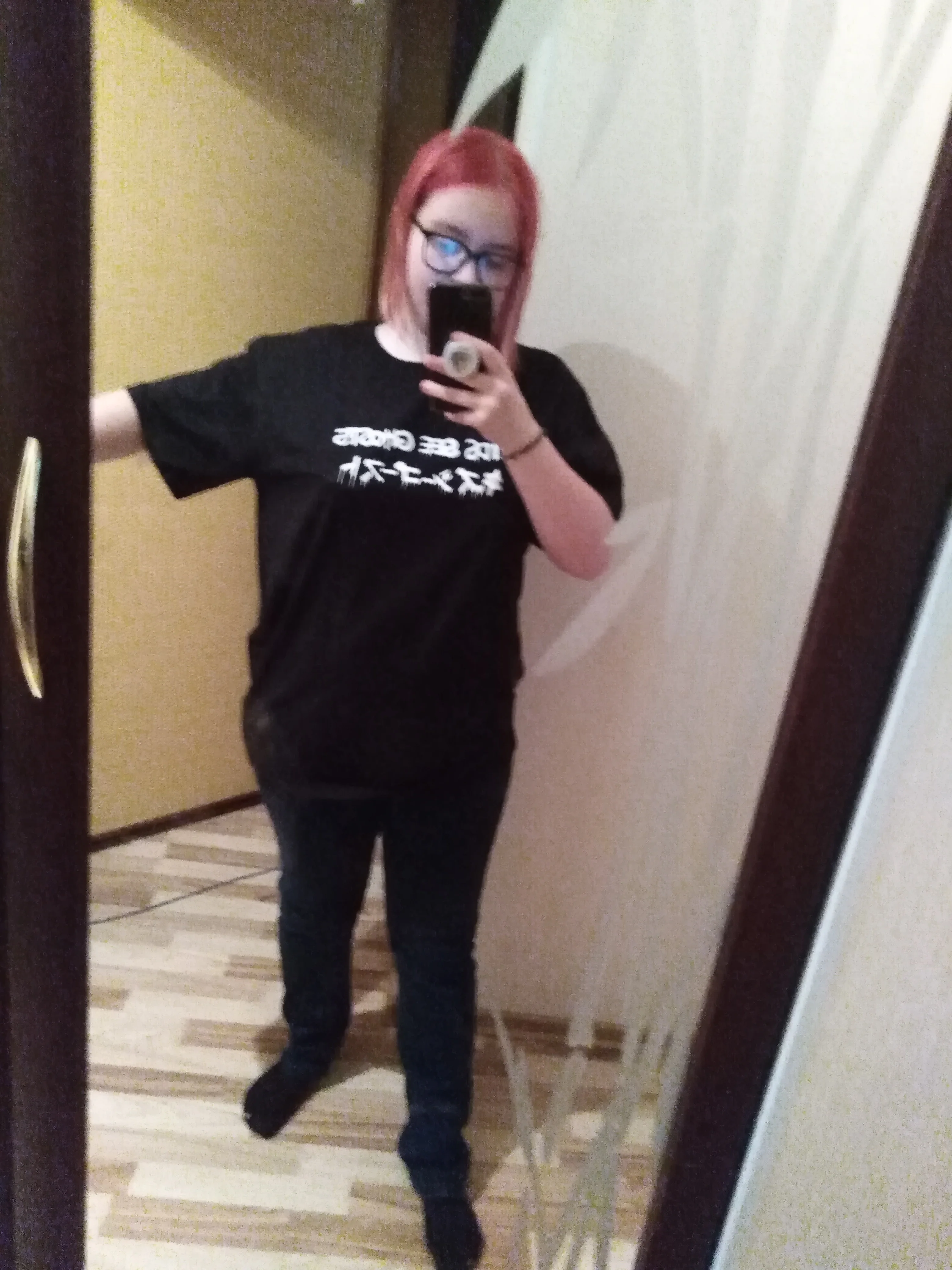 С продавцом не списывался, поэтому по своей неосторожности купил СЛИШКОМ большую футболку, даже для оверсайз:∆ Зато у меня новая ночнушка✌️ Ткань -- хлопок, но сама футболка среднего качества. Однако, всё же неплохая, поэтому я доволен.