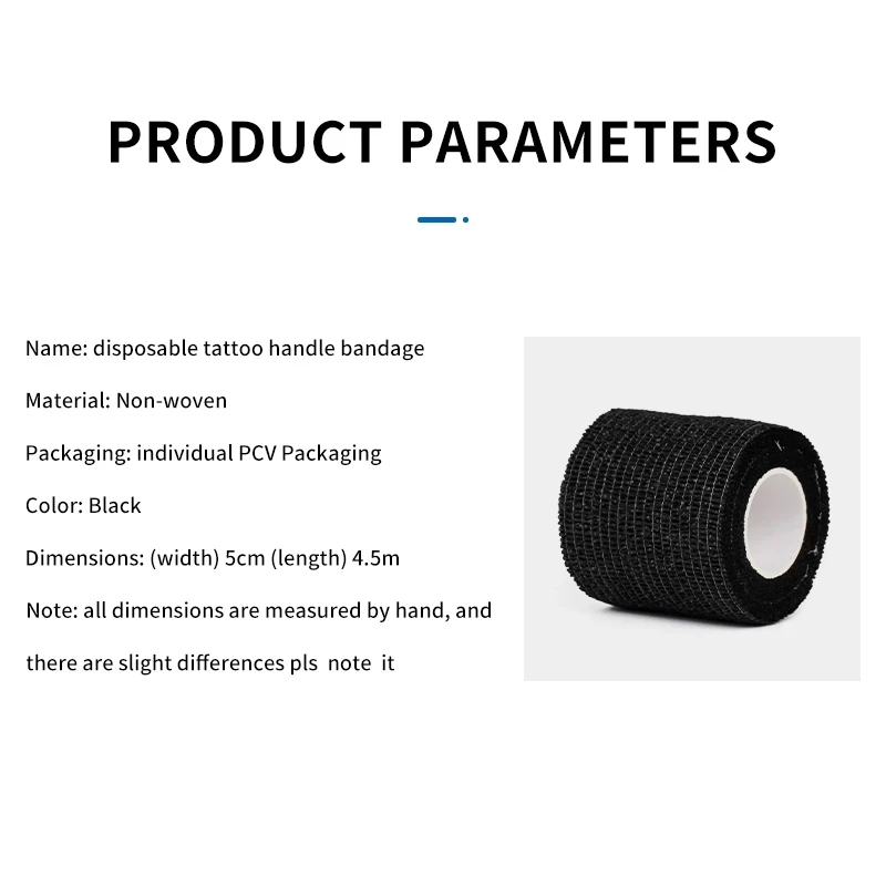 1. Материал: нетканый2. Цвет: черный3. Размеры: 5 см x 4,5 м4. Длина каждого рулона: 5 ярдов5. Используется для: тату Grip; Послеоперационная повязка на рану; Спортивная защита6. Характеристики: одноразовые, чистые и санитарно-гигиеническиеПодробнее о продукте: бандаж для татуПокрытие рукоятки машинки для татуажа Волшебная повязка