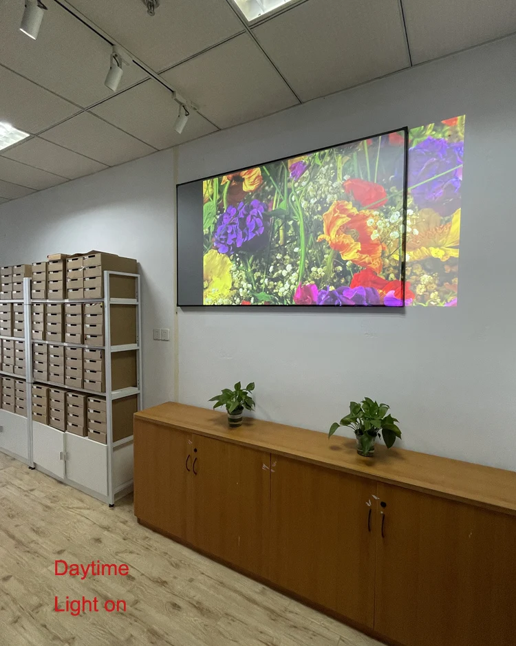 заказал самый маленький размер, не увидел что он без рамы(мне нужно было с рамой). Заранее просил не ультрокороткофокусный, а на дальний бросок. Натянул экран на стену. Итог свечу на него прямо проектором, засветка экрана получается неравномерная, есть в центре яркое пятно которое смещается вместе со смещением глаз и головы. Видны мелкие песчинки которые блестят. Не рекомендую данную продукцию.